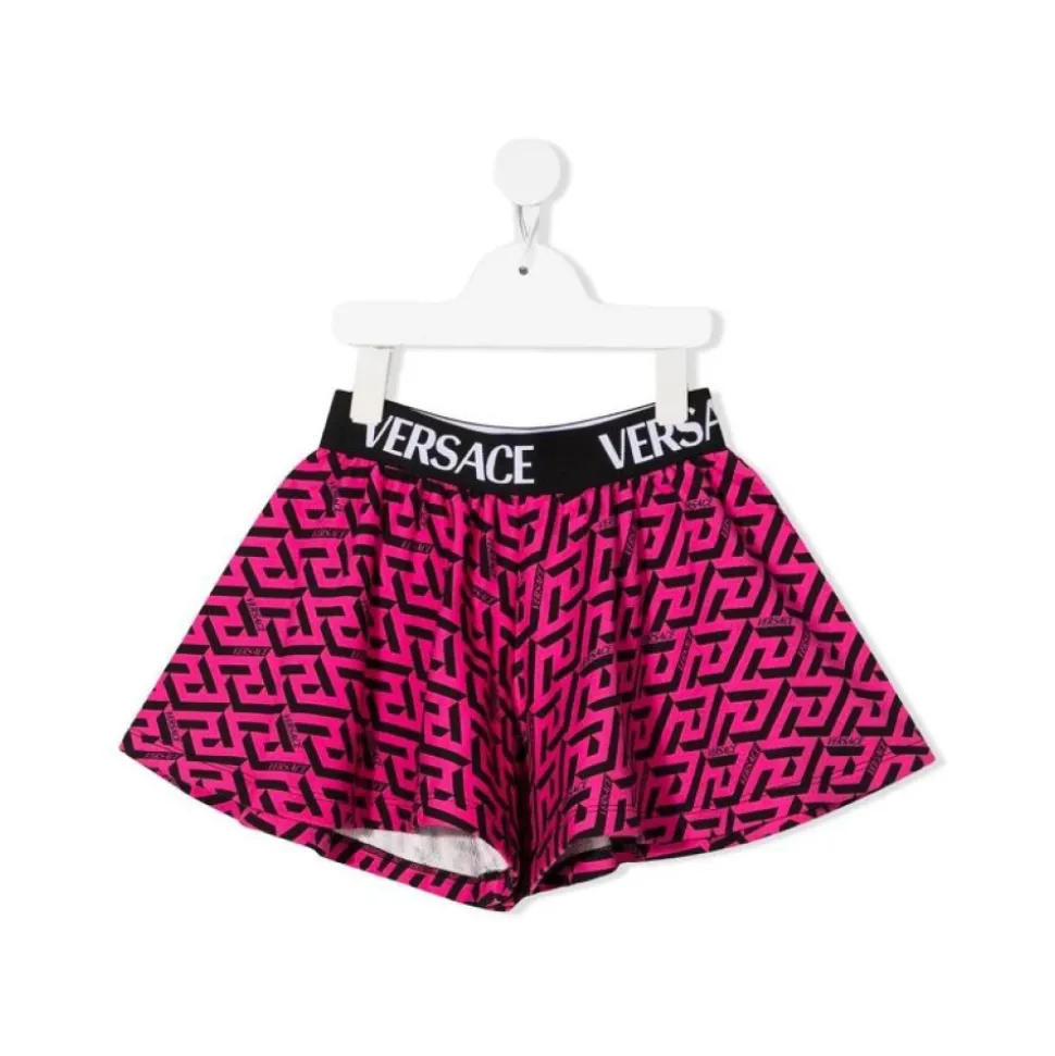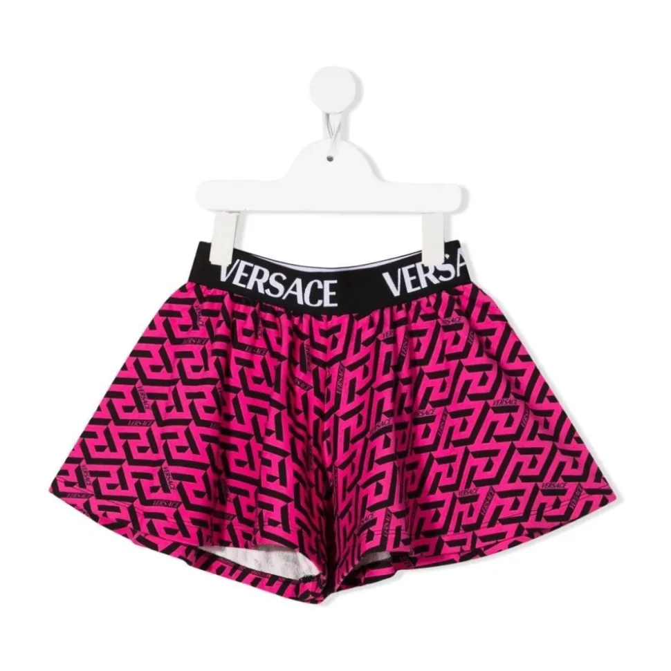 Kleed je kleine fashionista in deze stijlvolle Versace shorts. Met een gedurfde fuchsia roze print en een all-over grafisch ontwerp zijn deze shorts perfect voor elke trendy jonge meid. De zwarte logotailleband voegt een vleugje verfijning toe aan het speelse ontwerp.