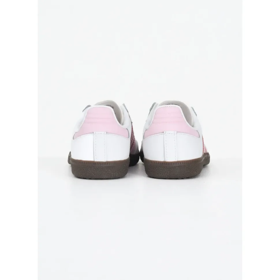 ADIDAS ORIGINALS Sneakers Samba Og wit en roze voor meisjes. De adidas Samba OG schoenen voor kinderen zijn een ware klassieker. Met een zacht leren bovenwerk en de iconische suède T-teen, is de Samba OG al sinds de jaren 50 aanwezig. Van voetbalvelden tot skateparken, deze schoen heeft onderweg een legioen fans verzameld. Met een rubberen zool en gemakkelijk te dragen kleuren en materialen, hebben deze schoenen een tijdloze maar moderne uitstraling. De glanzende lakleren 3 strepen geven ze een unieke afwerking. Herfst winter seizoen. Lage profiel witte sneakers voor meisjes. Materiaal details: Leer en rubber.