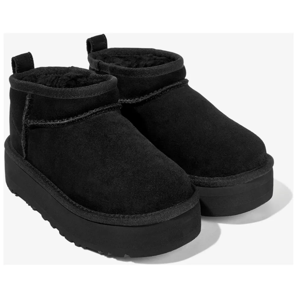 Verhoog de stijl van je kleintje met deze strakke UGG ultra mini platform zwarte laarzen. Gemaakt van hoogwaardig suède en voorzien van een asymmetrische bovenrand, tonen deze laarzen het innovatieve ontwerp en vakmanschap van UGG. Compleet met een schuimvoetbed en EVA Sugarcane buitenzool voor comfort en stijl. Inclusief achterste aantreklip, UGGplush™ wol en TENCEL™ lyocell voering en binnenzool, en geweven hiel label met UGG® logo.