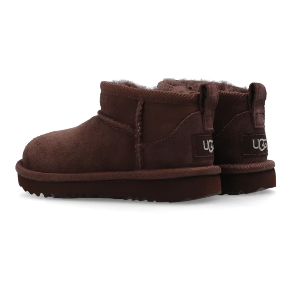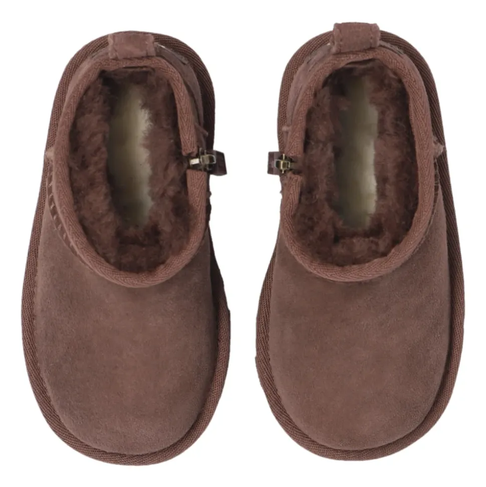 Bruine Classic Ultra Mini sneeuwlaarzen van UGG Kids. Gemaakt van suède, dit model zit op een bruine EVA-schuimzool en heeft een ritssluiting, de UGGplush ™ voering en een logopatch op de achterkant. Zoolhoogte: 2cm Zoolhoogte op het hoogste punt: 2,5cm
