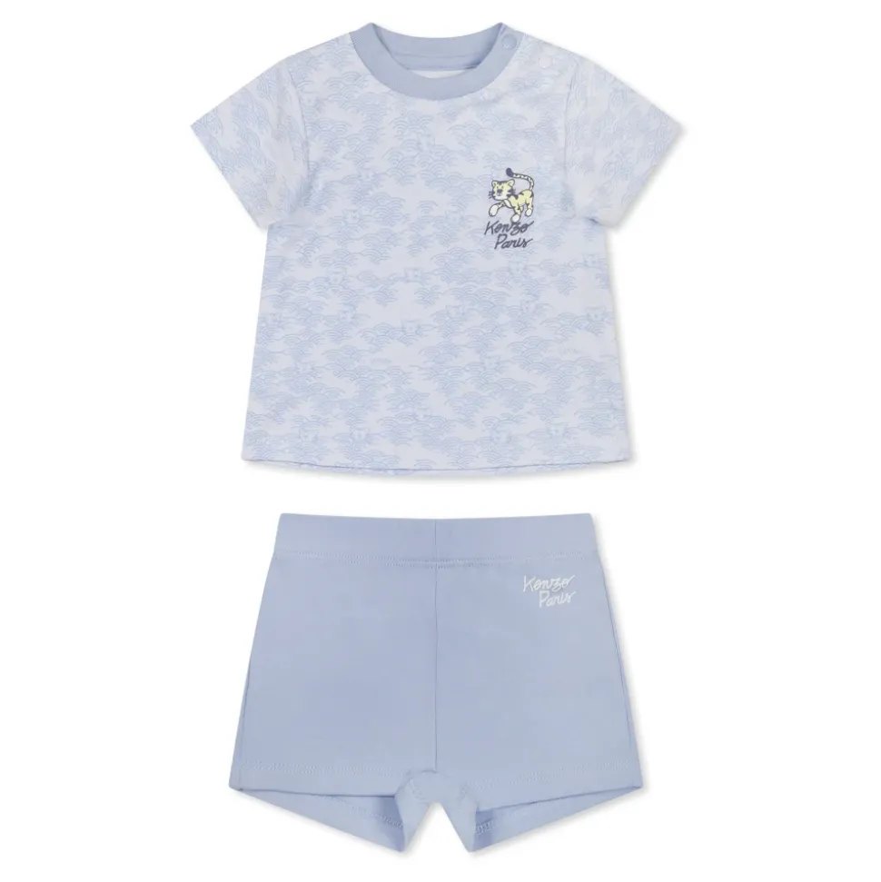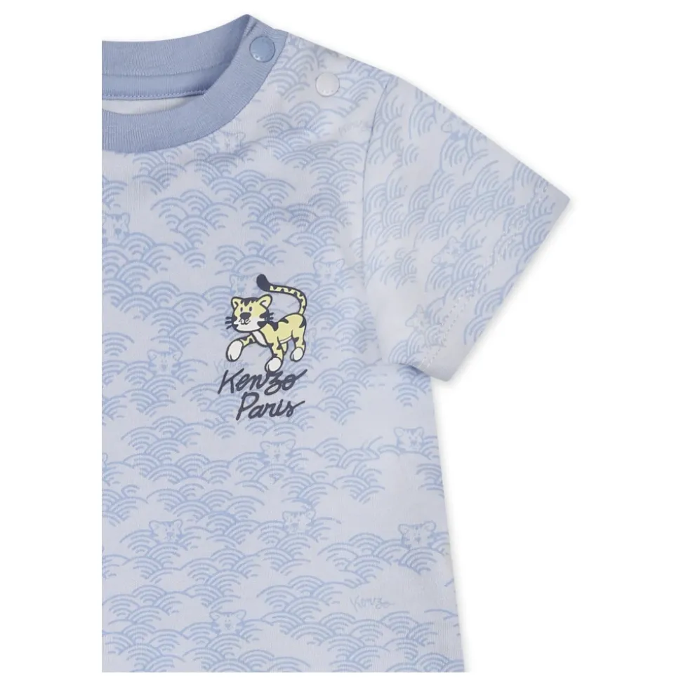 Kleed je kleintje in stijl met dit lichtblauwe pak van het Franse merk Kenzo Kids. Gemaakt van 100% katoen, deze set bevat een korte mouwen t-shirt met een geribbelde ronde hals en drukknoopsluiting, met een all-over tijgerprint en logo detail. De shorts hebben een elastische taille en een logo aan de voorkant. Machinewasbaar op 30°C.
