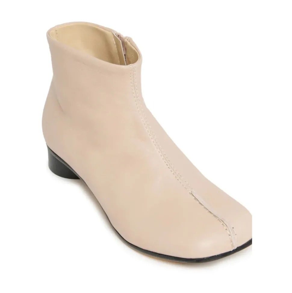 MM6 Maison Margiela lage leren laarzen met een cilindrische hak en verhoogde teennaad, ontworpen om je van alledaagse gelegenheden naar meer formele gelegenheden te brengen. Het ontwerp benadrukt de kenmerkende achterste steek van het merk en een interne rits voor gemakkelijk dragen. Belangrijkste kenmerken: Beige | Kalfsleer | Interne ritssluiting | Leren en thermoplastische zool | Verhoogde teennaad | Kenmerkende achterste steek | Cilindrische hak | Laag silhouet bij de enkel | Afmetingen & pasvorm: Hakhoogte: 2 cm | fit_information | Samenstelling & verzorging: 100% kalfsleer (bovenkant) | Leren zool | Thermoplastisch | Masoniet hak