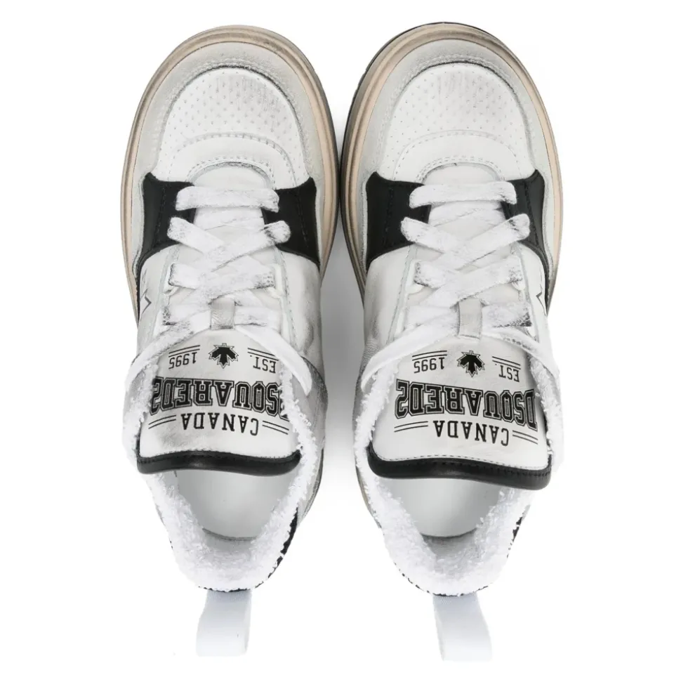 Dsquared2 Lage Sneakers met Veters combineren een vintage logo op de tong met een strak, alledaags silhouet, waarbij comfort en kenmerkende design details in balans zijn. Belangrijkste kenmerken: Wit | Bianco | Kalfsleer | Comfortgerichte constructie | Vetersluiting | Laag silhouet | Tong versierd met vintage logo | Samenstelling & onderhoud: Bovenkant: 94% kalf, 2% geit, 4% polyester | Voering: 80% katoen, 20% polyester | Binnenzool: 100% kalf | Zool: 100% thermoplastisch rubber | Niet chemisch reinigen. Niet in de droogtrommel. Niet bleken. Strijk op max. 110°C zonder stoom. Gebruik een kleurveilig wasmiddel en volg het wasetiket.
