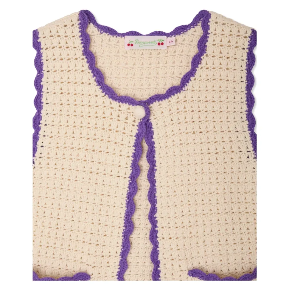 Bonpoint’s Laila Vest is een handgemaakt gehaakt kledingstuk dat gelaagde looks verfijnt met delicaat openwerk en verfijnde afwerkingen. Het vest valt op door de lichtgewicht katoenen constructie en decoratieve kersachtige hangers. Belangrijkste kenmerken: Beige | Violet | Katoen | Ademend | Lichtgewicht | Sluiting met één knoop | Ronde halslijn | Mouwloos | Open gehaakte textuur | Golvende, geschulpte randen | Kersvormige hangers | Afmetingen & pasvorm: Cropped pasvorm | Samenstelling & verzorging: 100% katoen