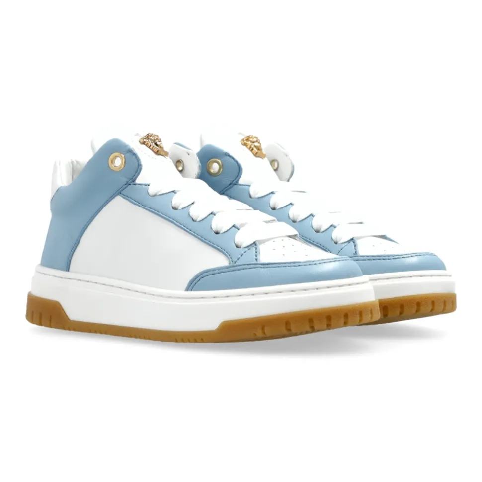 Ontdek de leren sneakers van Versace, een perfecte mix van sportieve stijl en luxe voor jonge modeliefhebbers. Deze sneakers hebben een opvallend lichtblauw en wit contrast met een gouden Medusa-ornament, wat zorgt voor zowel elegantie als individualiteit. Belangrijkste kenmerken: Lichtblauw | Wit | Leer | Elastische vetersluiting | Zijdelingse ritssluiting | Gouden Medusa-ornament | Brede witte veters | Afmetingen en pasvorm: Normale pasvorm | Samenstelling en onderhoud: 100% Leer | Reinig met een zachte doek