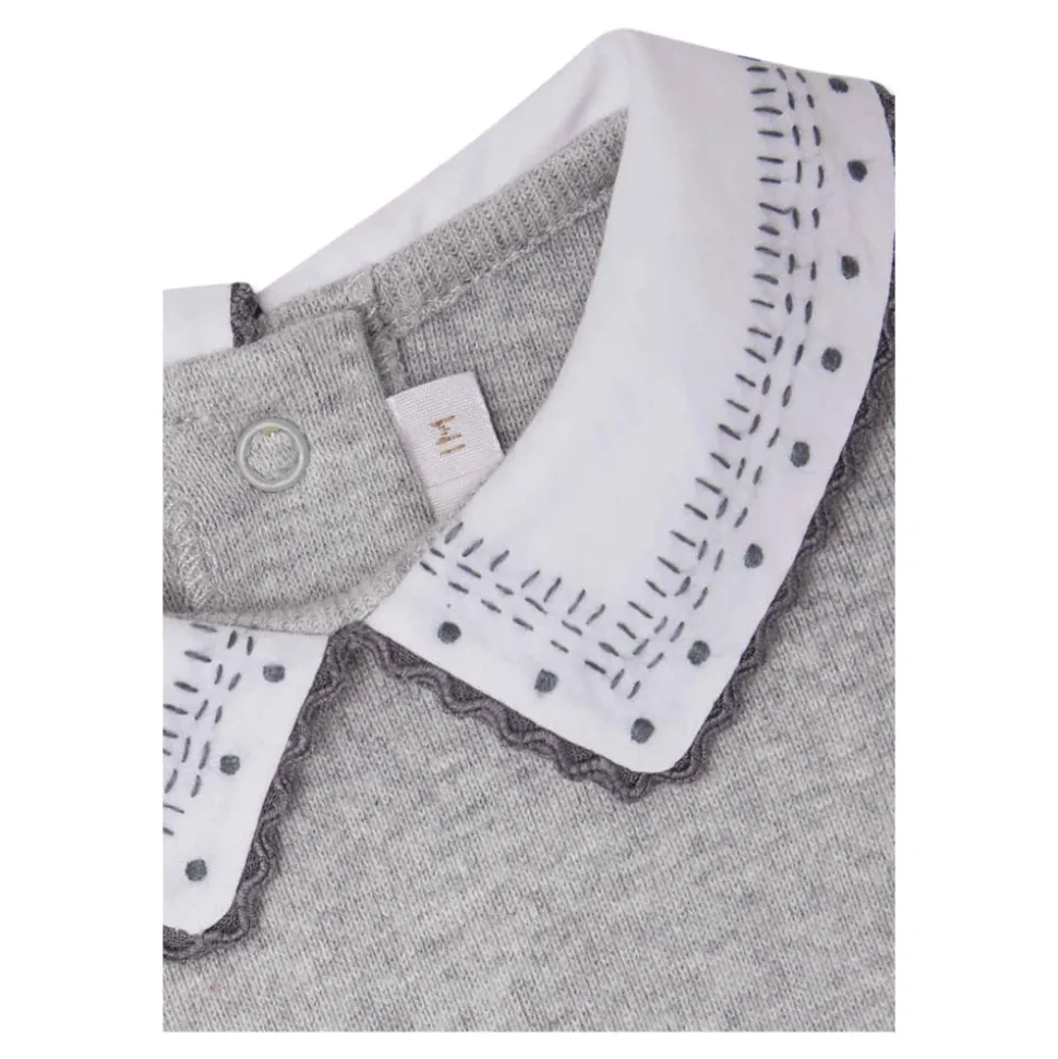COLTRUI-BODY door Bonpoint is een uniek aanbod voor de allerkleinsten, betoverend met zijn TIJDLOZE ELEGANTIE en subtiele details. Het hele stuk is vervaardigd in een verfijnde, lichtgrijze melange tint en gemaakt van het zachtste, delicate katoenen breisel, wat veiligheid en comfort garandeert, zelfs voor de meest gevoelige babyhuid. Het klassieke, gesloten ontwerp met lange mouwen en een praktische drukknoopsluiting in het kruis wordt versterkt door een VERFIJNDE PETER PAN-KRAAG, gemaakt van een contrasterende witte stof. Intrigerend grafisch borduurwerk en piping voegen een uniek karakter toe aan het stuk en benadrukken de exclusieve esthetiek van het modehuis Bonpoint. WAAROM IS DIT PRODUCT HET KOPEN WAARD? * Verfijnd katoen – veiligheid en comfort voor uw kind * Unieke, geborduurde kraag die zorgt voor een subtiele versiering * De klassieke Franse stijl gecombineerd met functionaliteit * Zachtheid en duurzaamheid van materialen van premium kwaliteit * Ontworpen door het gerenommeerde modehuis Bonpoint