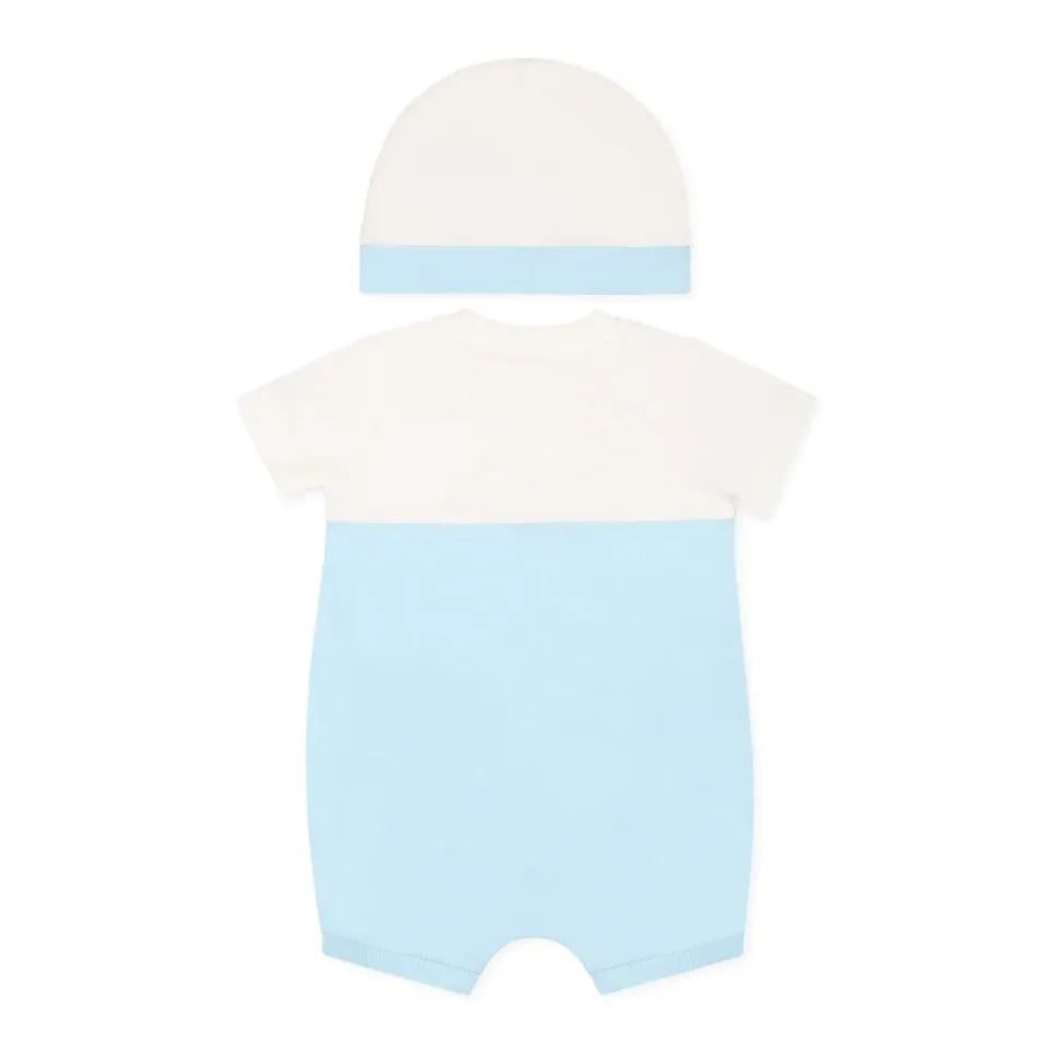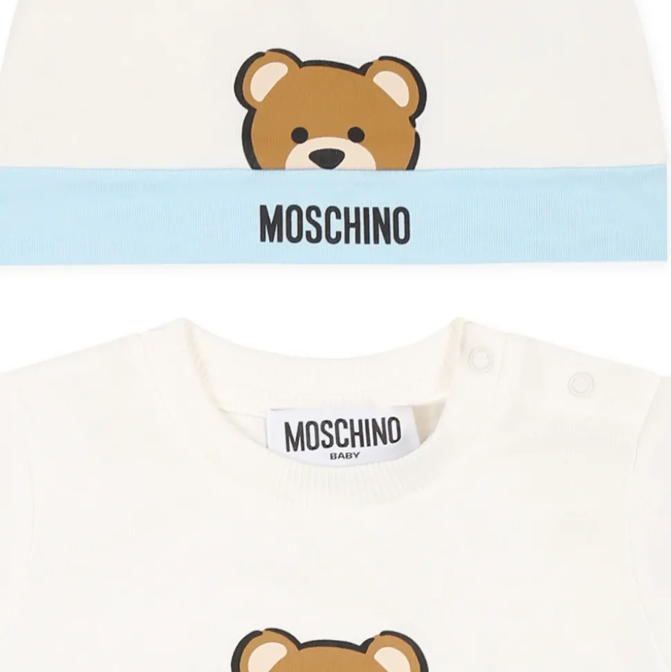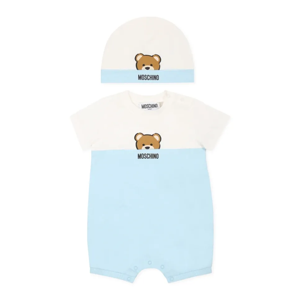 Kleed je kleintje in stijl met deze lichtblauwe romperset van Moschino Kids. Gemaakt van 100% katoen, deze set bevat een korte mouw romper met een Teddy Bear en logo versiering, en een witte hoed met een contrasterende beige rand. Perfect voor dagelijks gebruik, machinewasbaar op 30°C.