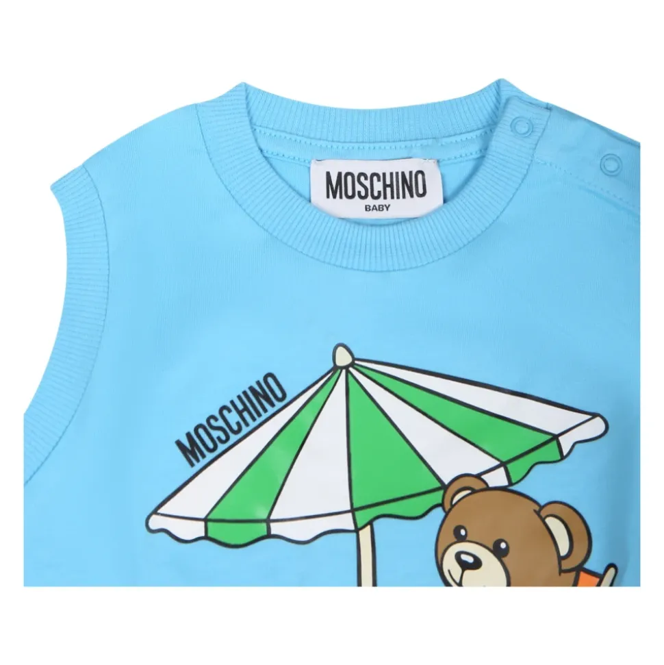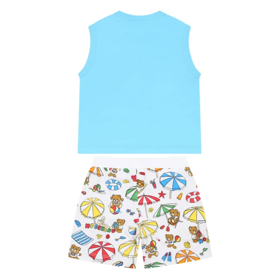 Kleed je kleintje in stijl met deze Moschino kinderset. Het hemelsblauwe sportpak is gemaakt van 100% katoen en bestaat uit een tanktop met een Teddy Bear en logo ontwerp, en witte shorts met een all-over Teddy Bear print. De tanktop heeft een ronde hals, geribbelde zoom en schouders, en drukknoopsluiting op de schouder, terwijl de shorts een elastische taille en zijzakken hebben. Machinewasbaar op 30°.