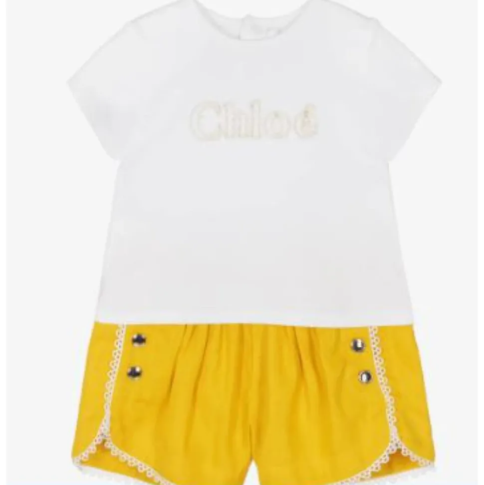 Deze luxueuze Chloé set bestaat uit een levendige gele linnen short, gecombineerd met een katoenen T-shirt versierd met een goudkleurig logo, perfect voor stijlvolle uitstapjes. Belangrijkste kenmerken: Geel | Linnen | Katoen | Goudkleurig logo | Samenstelling en onderhoud: 100% Linnen (Shorts) | 100% Katoen (T-Shirt) | Machinewasbaar op 30°C, binnenstebuiten strijken.