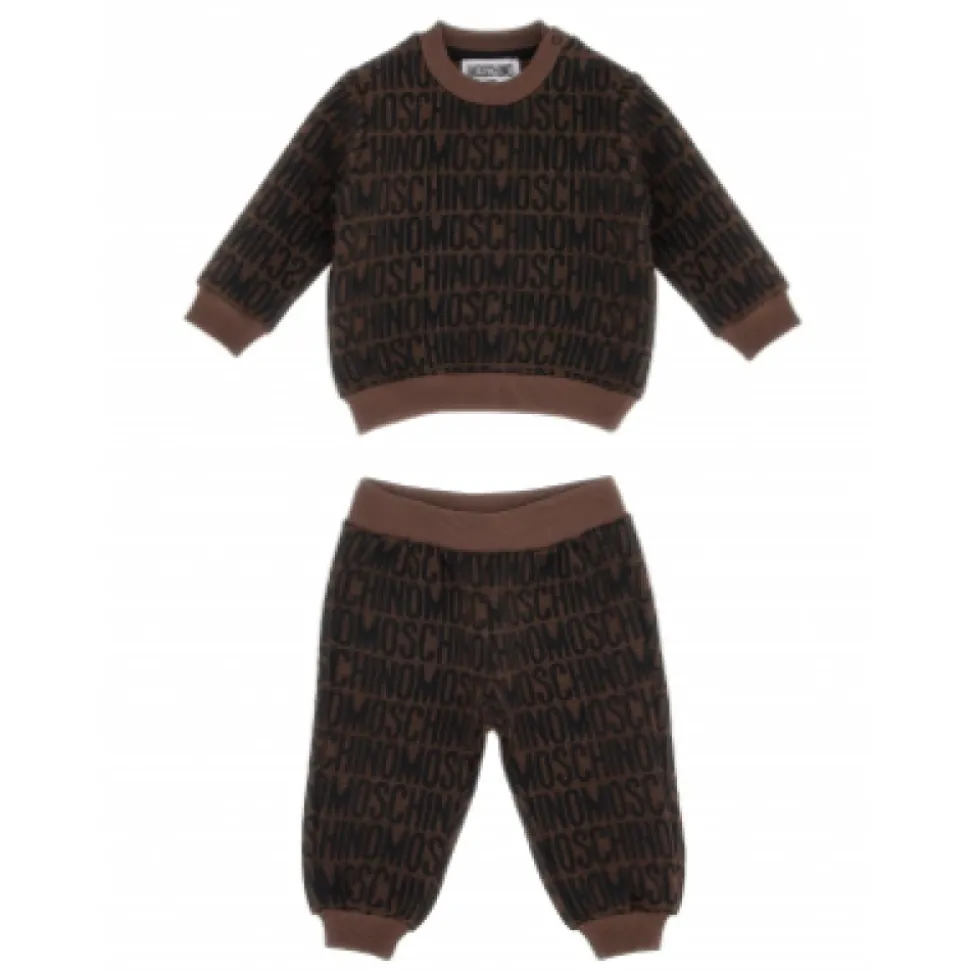 Kleed je kleintje in stijl met deze Moschino Suit Brown/Black set met overal logo belettering. De trui met ronde hals en broek set heeft lange mouwen, elastische taille, manchetten aan de enkels, geribbelde manchetten en elastiek voor een comfortabele pasvorm.