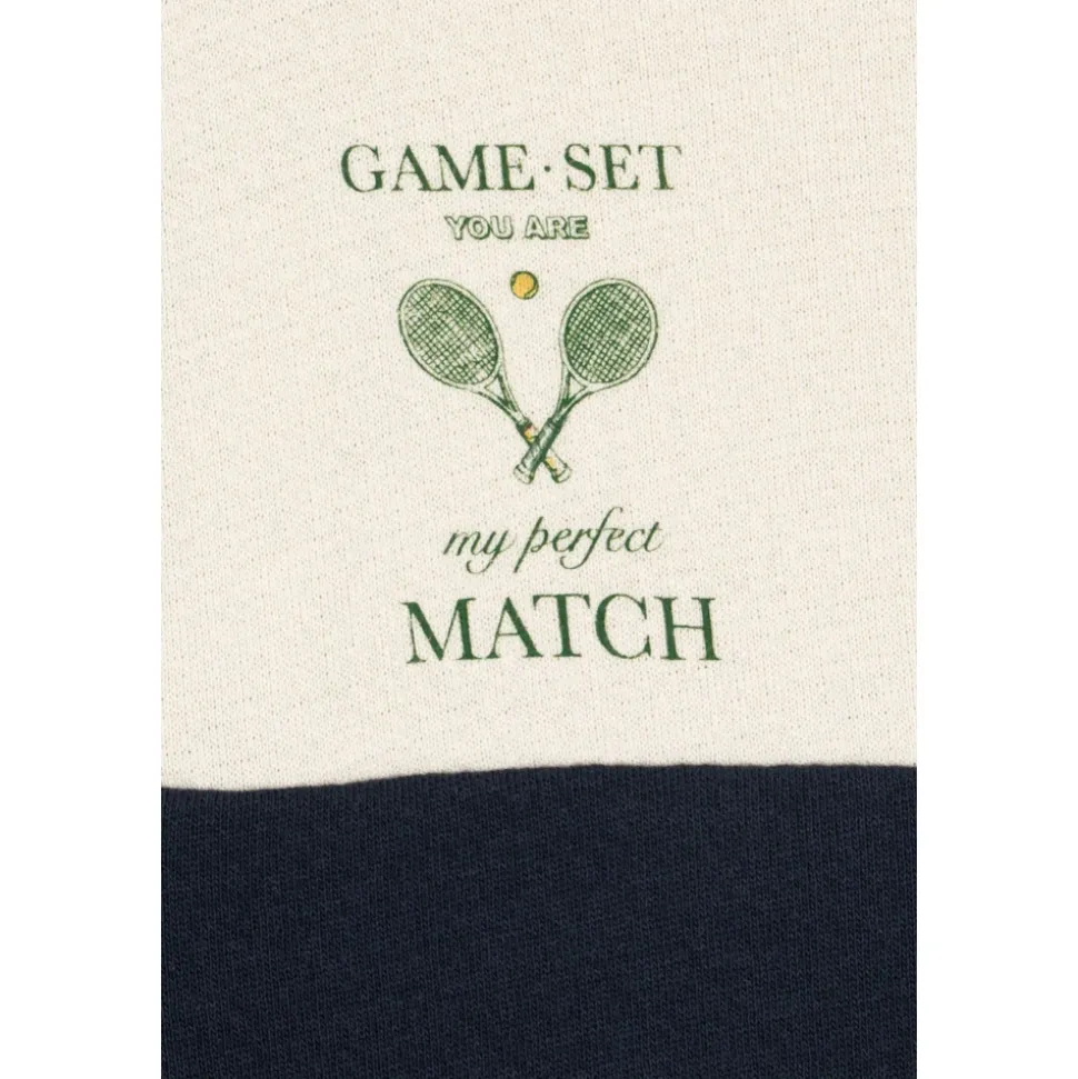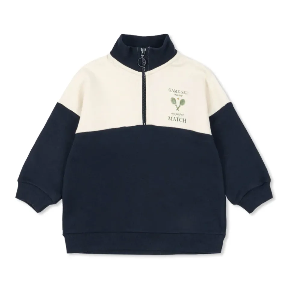 Konges Sløjd Loupy Lou Half Zip is een colorblock sweatshirt met een halve rits en een hoge opstaande kraag, ontworpen voor comfortabele laagjes op koelere dagen. Het combineert een relaxed silhouet met een subtiele tennisprint op de borst voor een sportieve, verfijnde look. Belangrijkste kenmerken: Crème | Marineblauw | Katoen | Zacht aanvoelend | Ademende stof | Warm comfort voor koeler weer | Halve ritssluiting met ronde trekker | Geribbelde boorden voor comfort en vormbehoud | Colorblock panelen (crème bovenkant, marineblauw onderkant en mouwen) | Opstaande kraag | Tennisprint op de borst | Relaxte geribbelde boorden | Lange mouwen | Afmetingen & pasvorm: Licht oversized pasvorm | Samenstelling & onderhoud: 100% katoen | Machinewas 30°C. Strijken op lage temperatuur indien nodig.