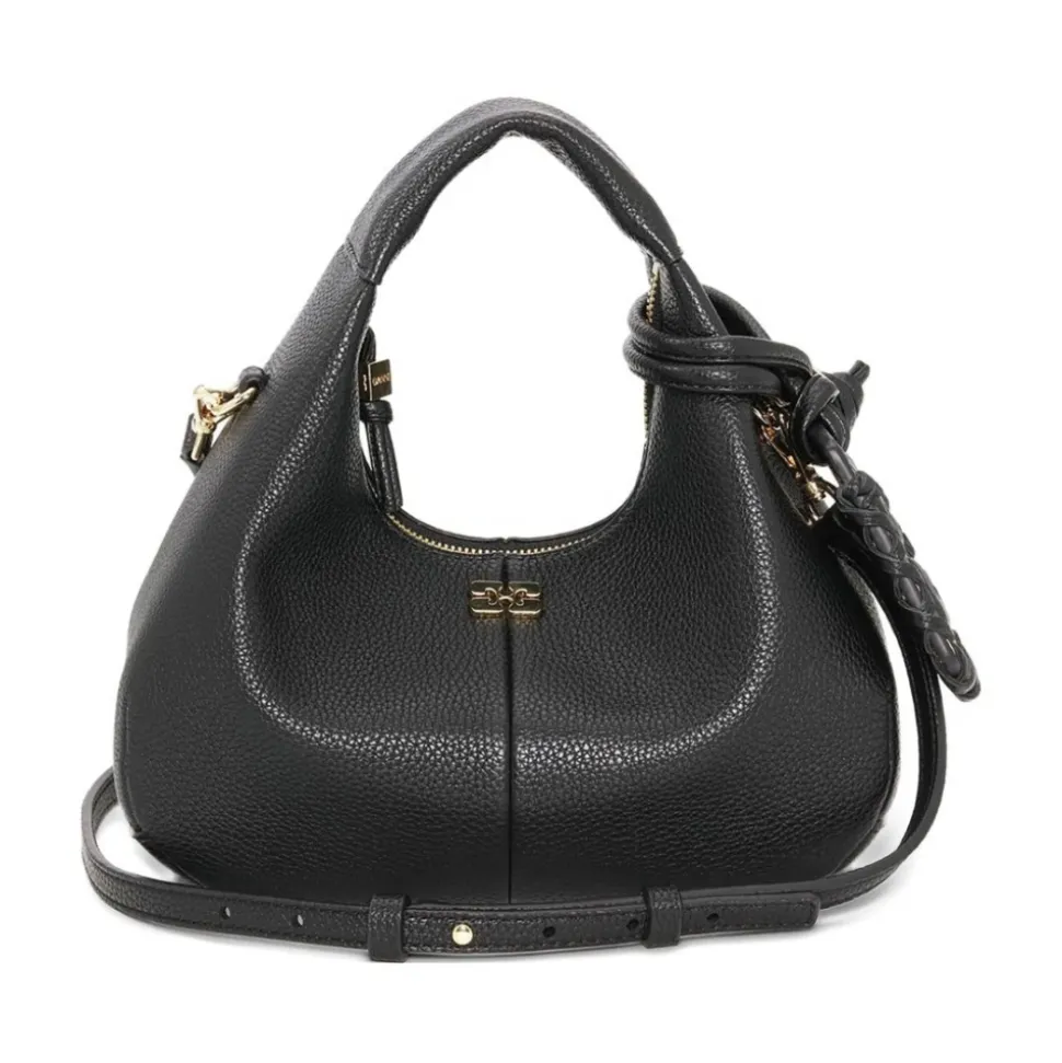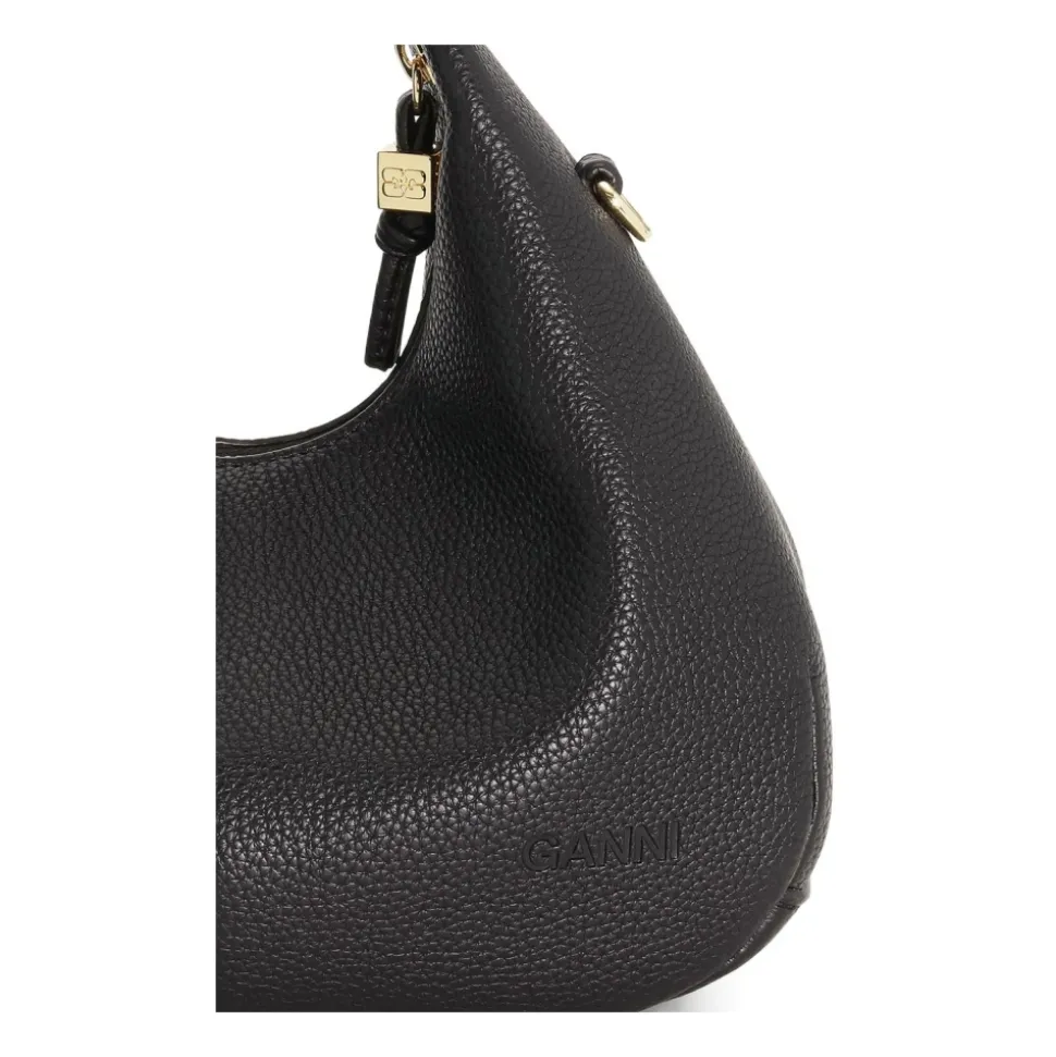 Upgrade je stijl met deze zwarte Ganni ‘Mini Hobo’ tas. Gemaakt met een korrelige textuur, heeft het een bovenhandvat, verstelbare en afneembare schouderriem, spiegelhangtag en een goudkleurig metalen logo aan de voorkant. De tas bevat ook goudkleurige metalen hardware, een intern compartiment met een opgestikte zak en een ritssluiting aan de bovenkant. Afmetingen: Hoogte – 24,5 cm, Breedte – 24 cm, Diepte – 12 cm, Riemlengte – 60 cm. Stofdetails: Buitenkant – 52% polyester, 48% polyurethaan; Voering – 85% polyester, 15% polyester.