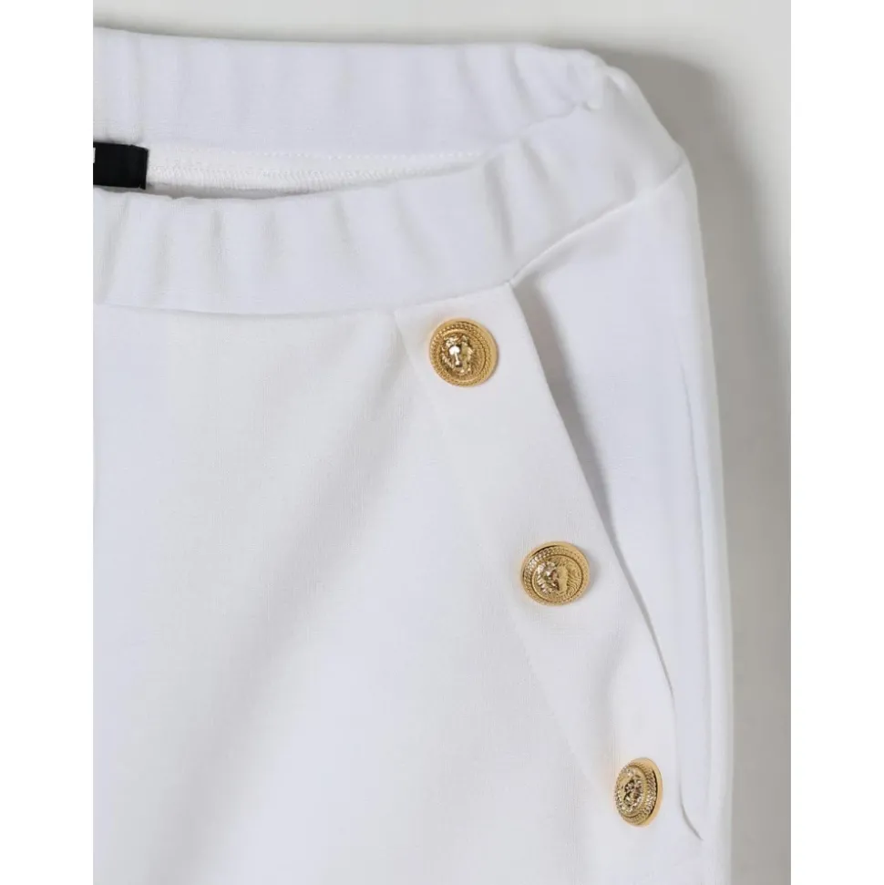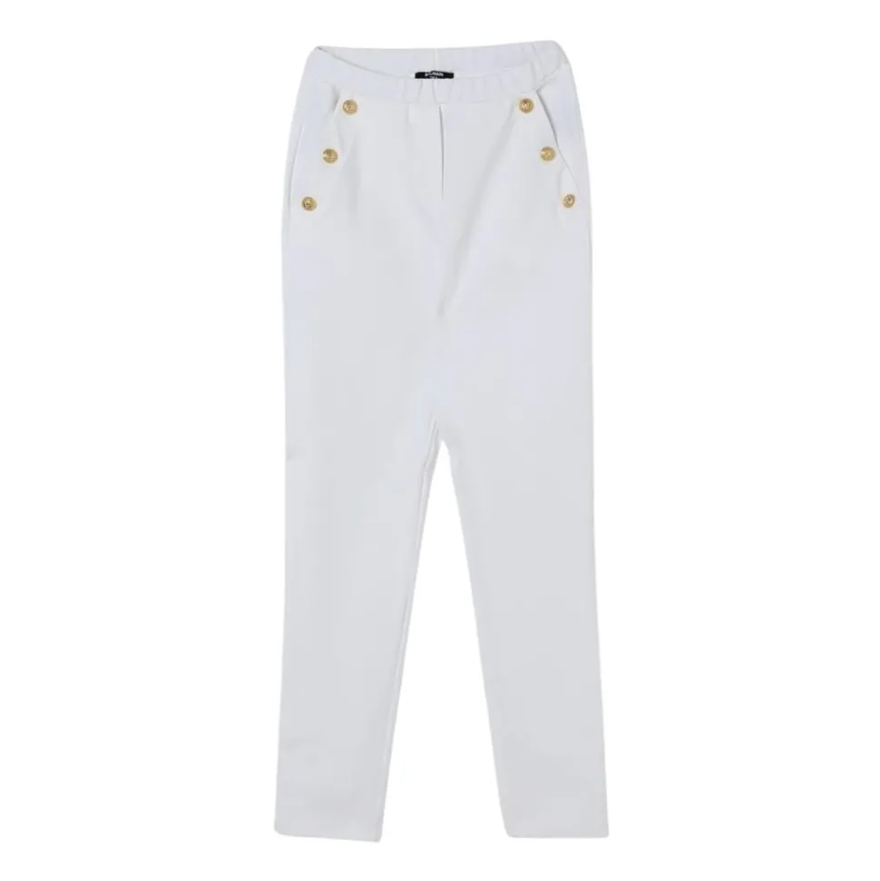 De Nautical Button Trousers van Balmain geven een klassieke maritieme look een update met een slanke silhouet en stijlvolle knoopaccenten, ideaal voor verzorgde alledaagse outfits. Belangrijkste kenmerken: Wit | Decoratieve knoopaccenten | Door de zeevaart geïnspireerd ontwerp | Slank silhouet | Stijlvolle knoopaccenten