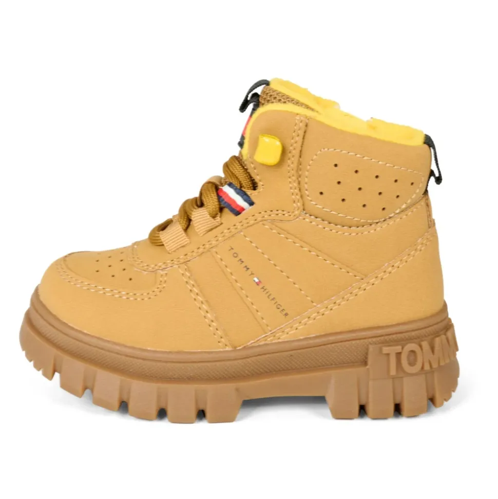Upgrade de stijl van je kind met deze okergele Tommy Hilfiger laarzen. Voorzien van een rubberen zool, vetersluiting en zijritssluiting, faux fur interieur en ronde neus. Versierd met een zijlogo en logopatch aan de voorkant. Gemaakt van 50% polyester en 50% polyester.