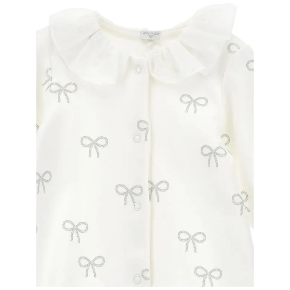 Monnalisa Onesie met Strikjes is een zachte katoenen romper met een ruche kraag en strikjesprint, ontworpen voor comfortabel de hele dag dragen en gemakkelijk aan- en uitkleden. Belangrijkste kenmerken: Beige | Crème | Katoen | Drukknoopsluitingen voor gemakkelijk aan- en uitkleden | Set van twee stuks | Ruche kraag | Lange mouwen | Strikjesprint | Samenstelling & onderhoud: 100% Katoen | Machinewas op 30°C.