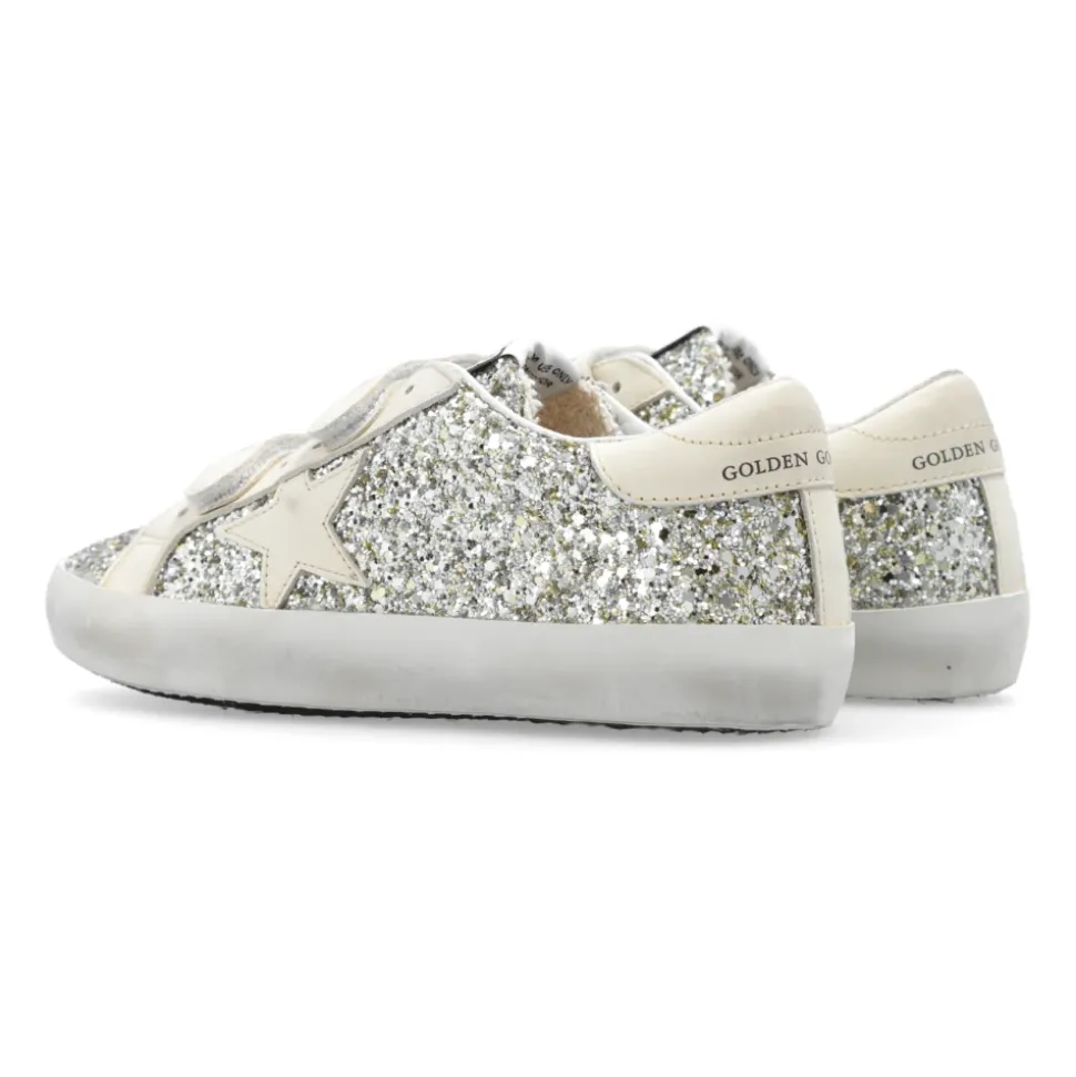 Sneakers in ‘Old School’-stijl van Golden Goose Kids. Gemaakt van leer en opgevrolijkt met zilverkleurige glitter, dit model zit op een zwarte en crèmekleurige rubberen zool en toont een bedrukt logo, een logopatch, een kenmerkende sterrenpatch, verontruste details en klittenbandsluitingen. Zoolhoogte: 2cm Klanten hebben gemeld dat dit merk groot uitvalt. We raden aan om één maat kleiner te kiezen dan je gebruikelijke maat.