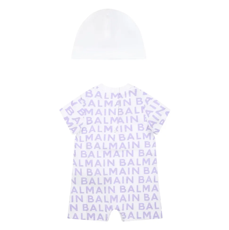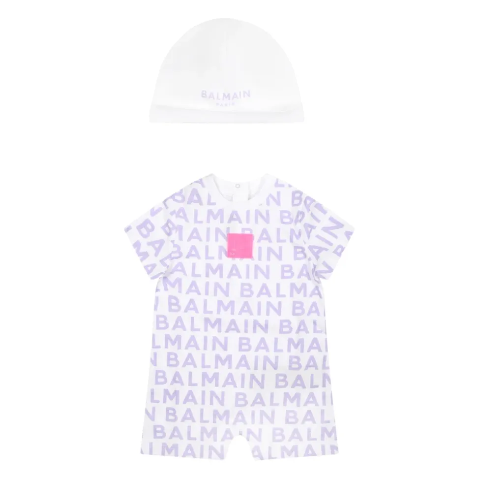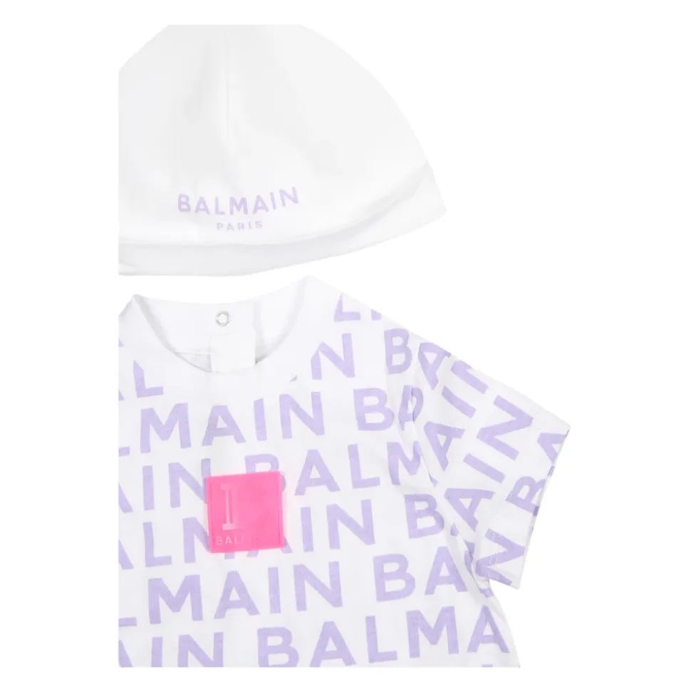 Kleed je kleintje in stijl met deze paarse Balmain set gemaakt van 100% katoen. De romper heeft korte mouwen, geribbelde ronde hals, drukknoopsluiting en logo-details overal met een neonroze logopatch. De bijpassende muts met omslag is ook versierd met het voorlogo. Machinewasbaar op 30°C.