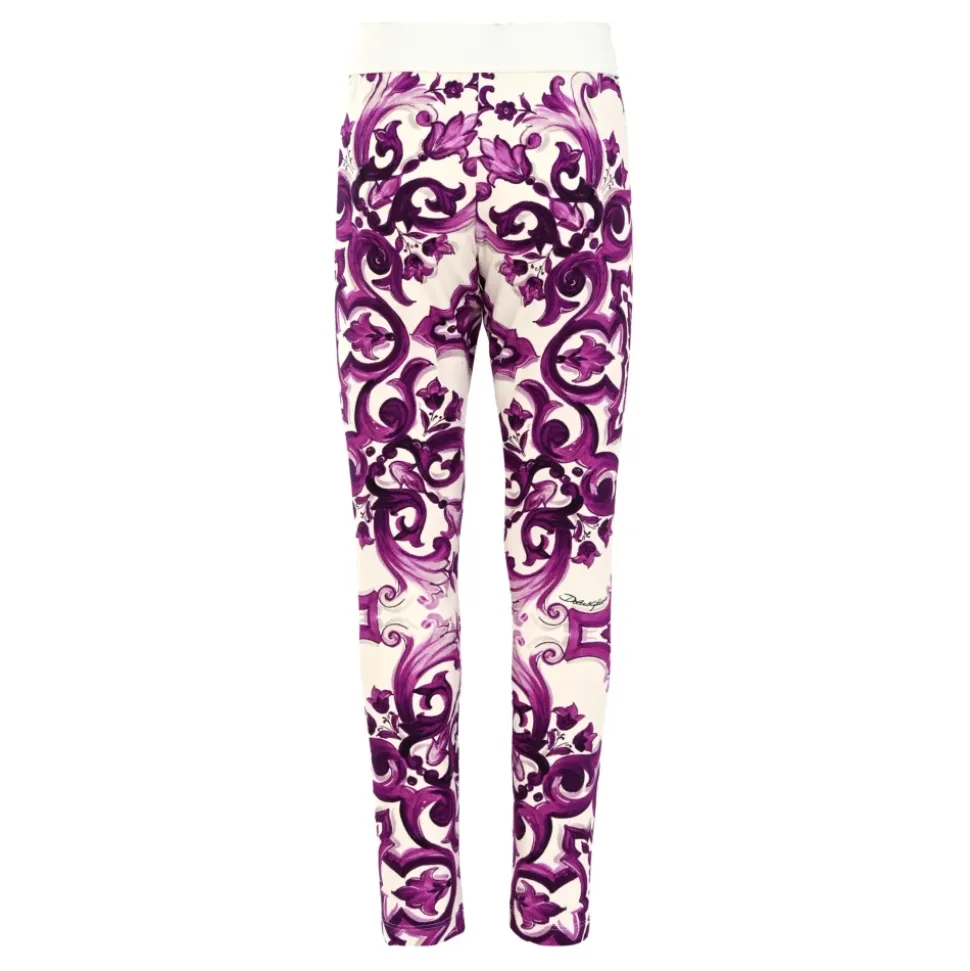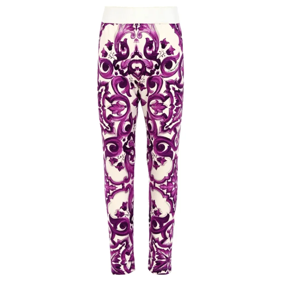 Upgrade de garderobe van je kleine meid met deze luxueuze paarse leggings van Dolce & Gabbana Kids. Voorzien van een witte elastische tailleband en een paars majolicaprint over het geheel, is elk stuk uniek met zijn eigen charmante onregelmatigheden. Gemaakt in Italië van 95% katoen en 5% elastaan. Machinewasbaar op 30°C.
