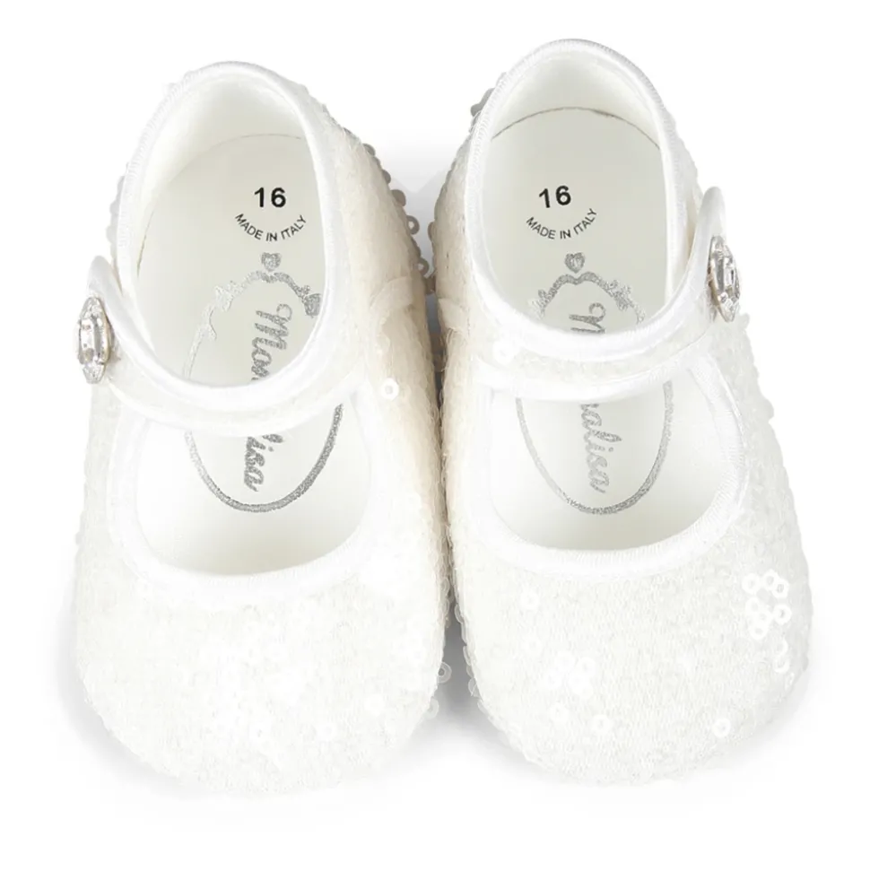 Verrijk de stijl van je kleine meisje met deze Monnalisa ballerina schoenen in het wit. Gemaakt in Italië, deze balletflats hebben een enkelbandje, zijknop en all-over pailletten. Gemaakt van 100% polyester.