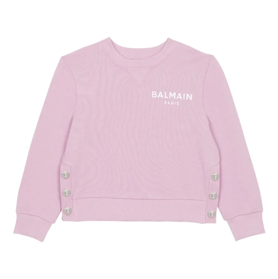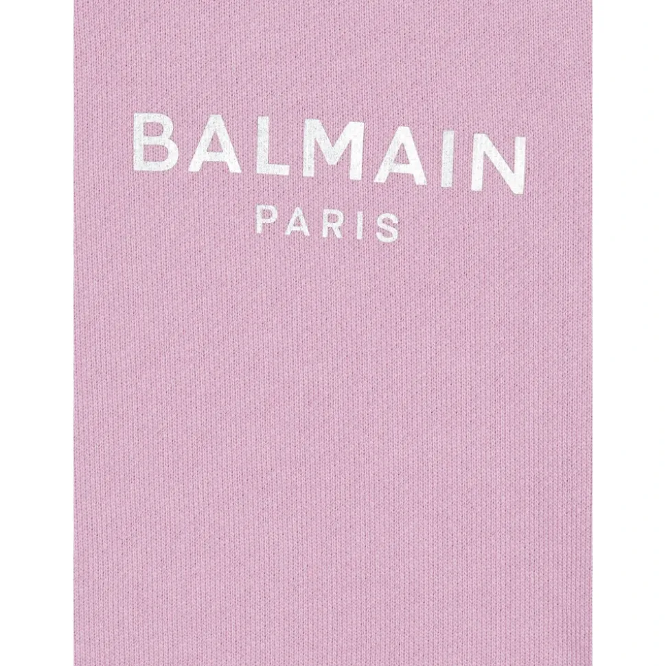 Balmain presenteert de Paris Sweatshirt, een opvallende katoenen sweatshirt met een geprint zilveren Balmain Paris logo en decoratieve zilveren drukknopen aan de zijkanten. De stevige katoenen jersey en geribbelde boorden maken het geschikt voor dagelijks gebruik met een kenmerkende branded look. Belangrijkste kenmerken: Paars | Katoen | Dikke katoenen jersey | Drukknoopsluitingen aan de zijkant | Zilveren metalen drukknopen met reliëf B | Ronde halslijn met V-vormige elastische inzet | Lange mouwen | Geribbelde randen aan manchetten, taille en hals | Geprint zilveren Balmain Paris logo op de voorkant | Samenstelling & verzorging: 100% katoen | Machinewas op 30°C.