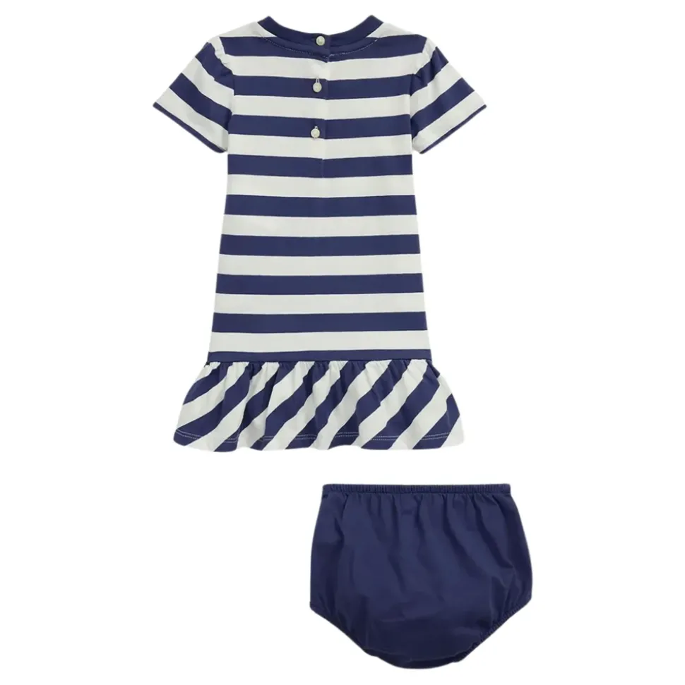 Ralph Lauren Polo Bear Gestreept Katoenen Jurkje combineert zacht katoencomfort met een speelse teddybeerprint in het midden. Ontworpen voor dagelijks gebruik, met een rucheszoom en een knoopsluiting aan de achterkant voor gemakkelijk aankleden. Belangrijkste kenmerken: Blauw | Wit | Katoen | Stretchy stof | Zacht katoen | Knoopsluiting aan de achterkant | Inclusief bijpassend broekje (kleinste maat) | Inclusief broekje met elastische randen | Ronde hals | Korte mouwen | Gestreept patroon | Teddybeerprint in het midden | Rucheszoom | Afmetingen en pasvorm: Rechte pasvorm | Stretchy stof voor bewegingsvrijheid | Samenstelling en onderhoud: 100% katoen | Machinewas op 30°C.