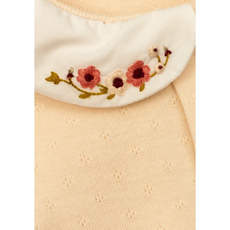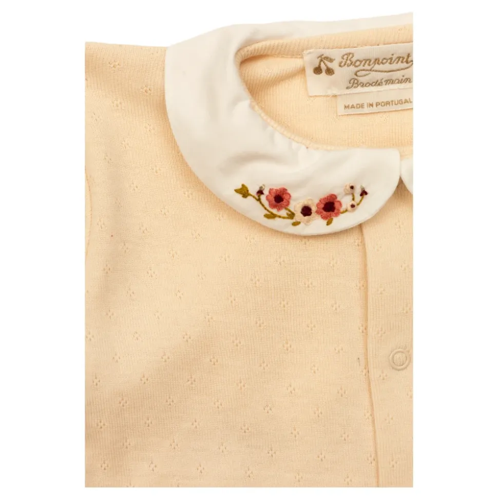 COLLARED PYJAMAS van Bonpoint zijn het toonbeeld van subtiele Franse elegantie, ontworpen voor de jongste kenners van comfort en stijl. De licht opengewerkte stof, vervaardigd van de fijnste katoen, omhult de huid van een kind met zachtheid, ademend met de delicatesse van de meest exquise stoffen. Het klassieke, eendelige ontwerp met lange mouwen en pijpen betovert met zijn praktische karakter, biedt volledige bewegingsvrijheid en thermisch comfort gedurende de hele nacht. De volledige voorkant sluiting maakt het eenvoudig om te verschonen, terwijl de decoratieve afgeronde kraag in witte stof prachtig contrasteert met de subtiele roze achtergrond van de pyjama’s. Het krijgt een vleugje bijzondere verfijning door het delicaat geborduurde bloemenmotief, vervaardigd met buitengewone zorg – een handtekening van de Bonpoint-collectie en de tijdloze stijl van dit Parijse merk. WAAROM DIT PRODUCT KIEZEN? * Natuurlijk, katoen garandeert zachtheid en veiligheid voor de gevoelige huid van een kind. * Klassieke elegante esthetiek verrijkt met met de hand geborduurde bloemaccenten. * Praktische en comfortabele volledige voorsluiting. * Uitzonderlijk Frans merk gewaardeerd door families over de hele wereld. * Uniek detail – een verfijnde, contrasterende kraag met borduurwerk.