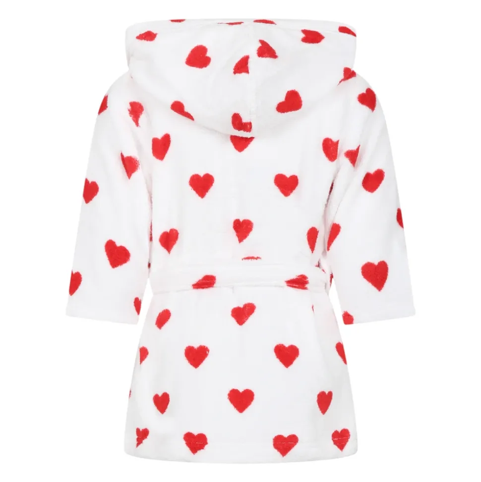 Merk: Petit BateauCategorie: Kinderen PyjamasBeschrijving: Kleur: Wit. Witte katoenen badjas met afneembare witte gestreepte riem, capuchon, lange mouwen. Versierd met rode harten. Details: 100% Katoen. Wassen op 40°.