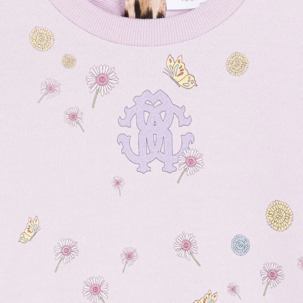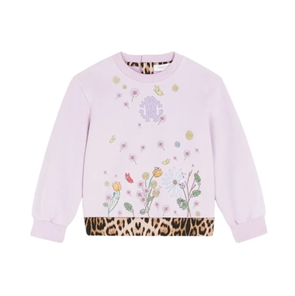 De Roberto Cavalli RC Monogram Cotton Sweatshirt is voorzien van het kenmerkende RC-motief van het label, omlijst door grillige bloemenborduursels. Ontworpen in Italië, het is een stijlvol alledaags sweatshirt met een gemakkelijke drukknoopsluiting. Belangrijkste kenmerken: Paars | Katoen | Elastische boorden | Drukknoopsluiting achter | Ronde hals | Lange mouwen | Rechte zoom | RC Monogram motief | Bloemenborduursel | Samenstelling & verzorging: Externe stof: 100% Katoen | Secundaire stof: 100% Katoen | Handwas; niet bleken; niet in de droogtrommel; plat laten druppelen; strijken op maximaal 110°C; niet chemisch reinigen.