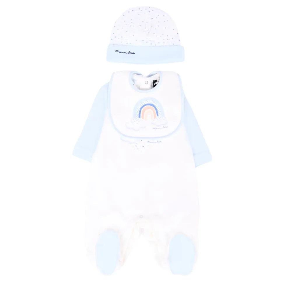 Kleed je kleintje in stijl met deze Monnalisa witte katoenen babygrow set. De set bevat een babygrow met een Peter Pan kraag en regenboogprint, een muts met stippen en een geborduurd logo, en een slab met een regenboogprint. Gemaakt van 100% katoen. Machinewasbaar op 30°C.