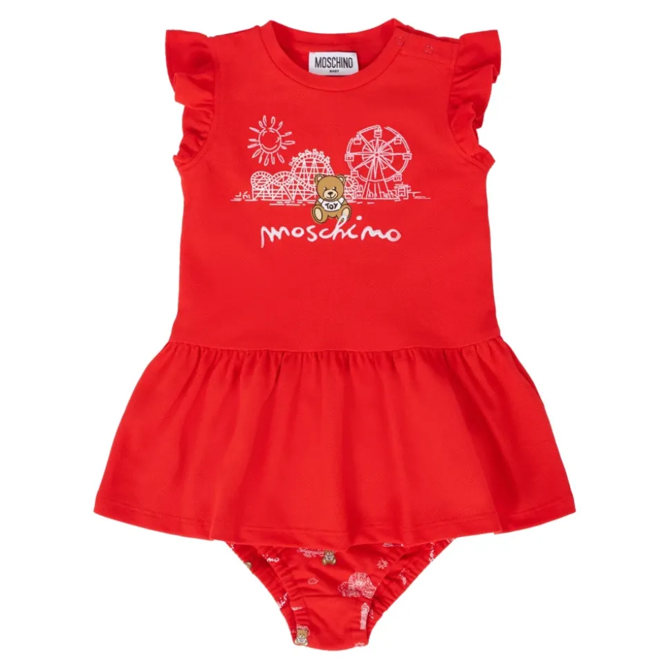 Kleed je kleintje in stijl met deze rode Moschino Kids jurkenset, gemaakt van comfortabele piquet stof. De jurk heeft korte mouwen met ruches, een geribbelde ronde hals, drukknoopsluiting en een schattige volant onderaan, gecombineerd met bijpassende culottes. Versierd met een Teddy Bear print en geborduurd logo, is deze set zowel chique als speels. Gemaakt van 95% katoen en 5% elastaan, is het gemakkelijk te onderhouden met machinewas op 30°C.
