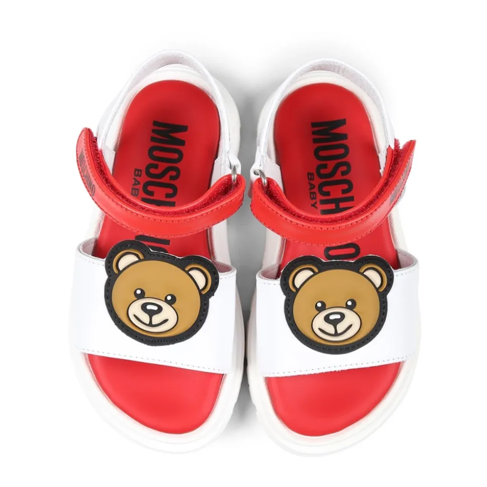 Upgrade de stijl van je kleintje met deze rode leren Moschino sandalen. Gemaakt in Italië, deze sandalen hebben een rubberen zool, enkelband met klittenbandsluiting, en zijn versierd met een Teddy Bear aan de voorkant en logo aan de zijkanten. Gemaakt van 100% leer.