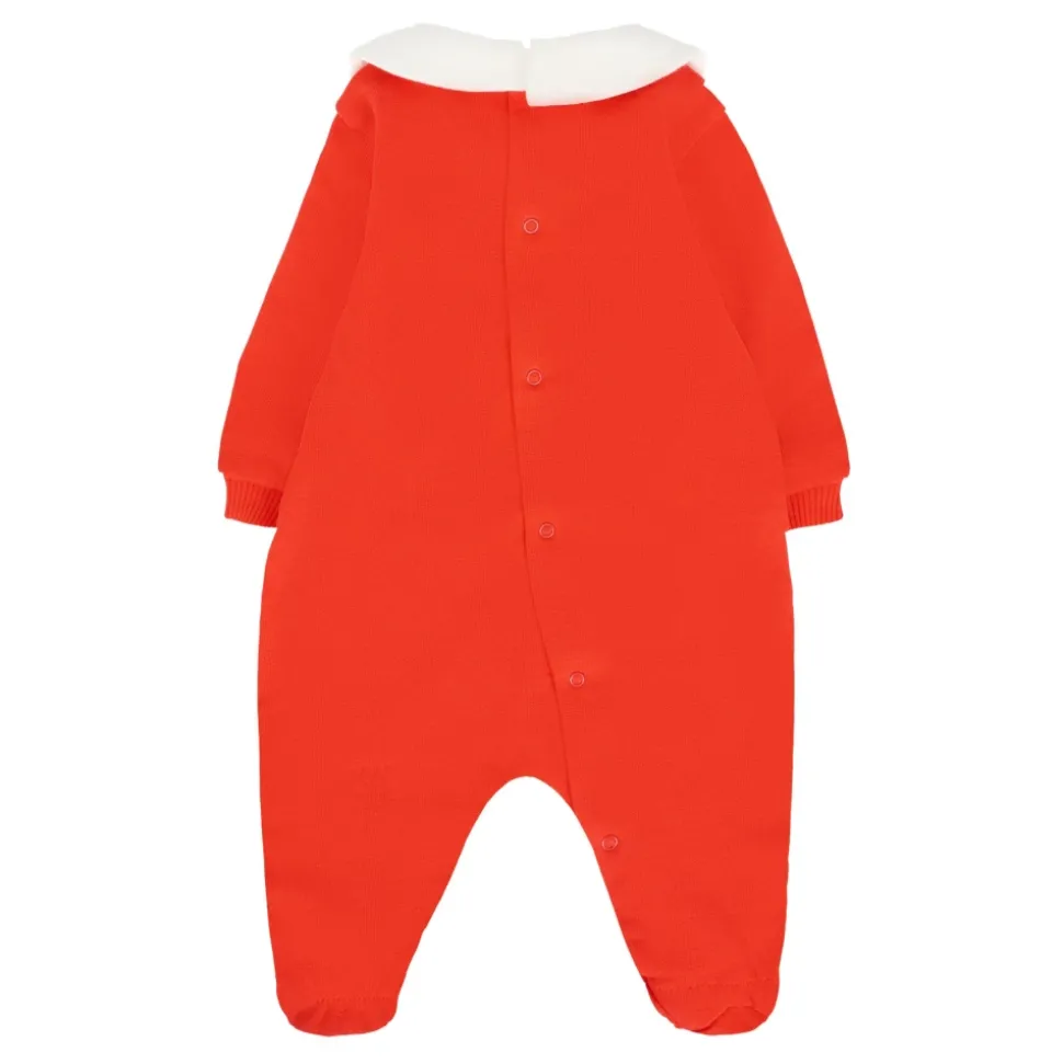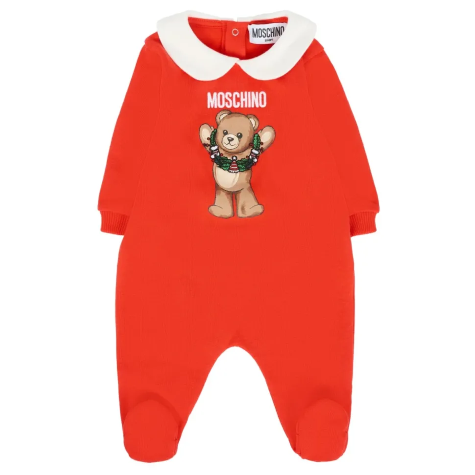Kleed je kleintje in stijl met deze rode Moschino Kids romper van fleece katoen. Met lange mouwen, een witte Peter Pan kraag, drukknopen op de achterkant, voetjes en geribbelde manchetten, is deze romper versierd met een Teddy Beer print met een kerstkrans en geborduurd logo op de voorkant. Gemaakt van 100% katoen, is het gemakkelijk te onderhouden met machinewas op 30°C.