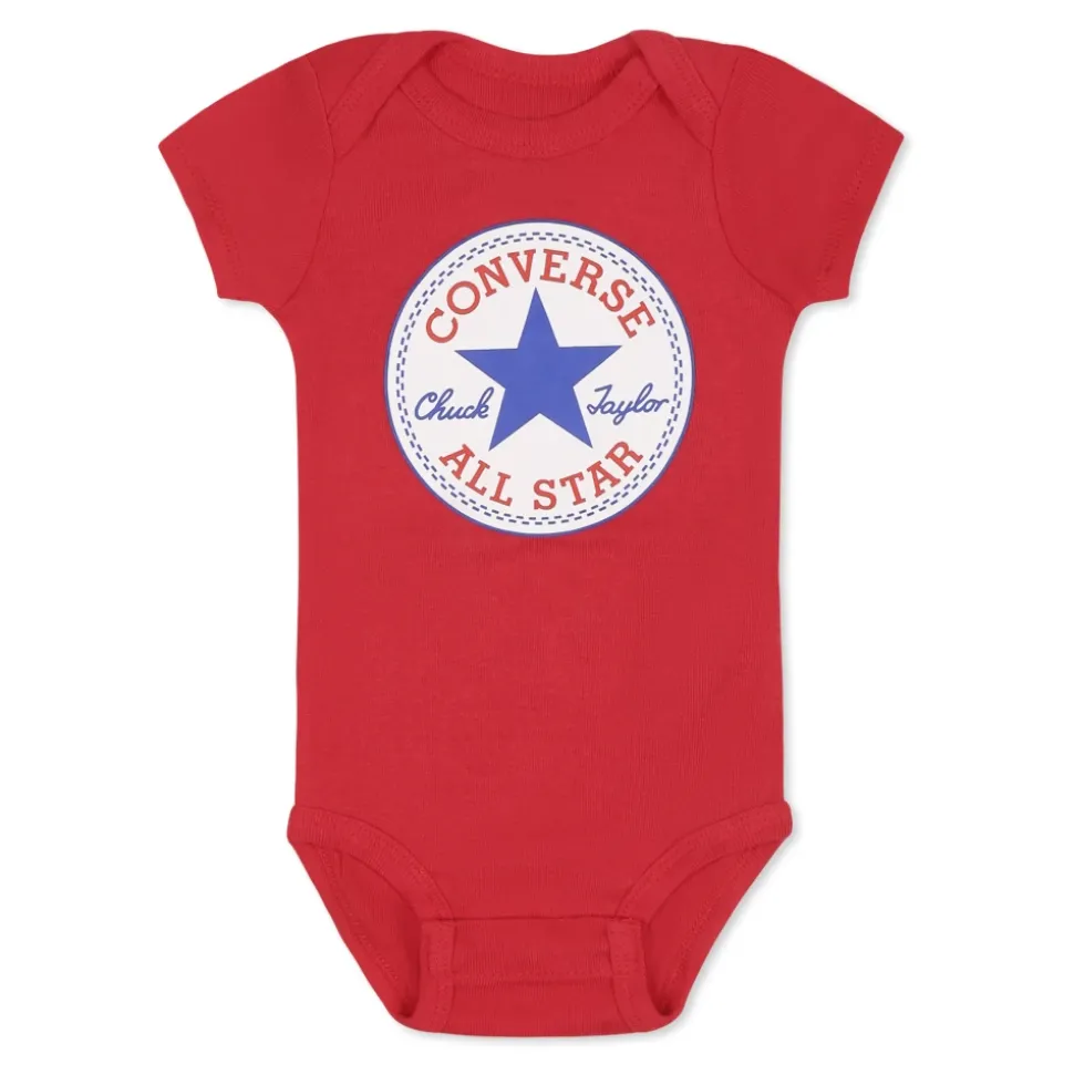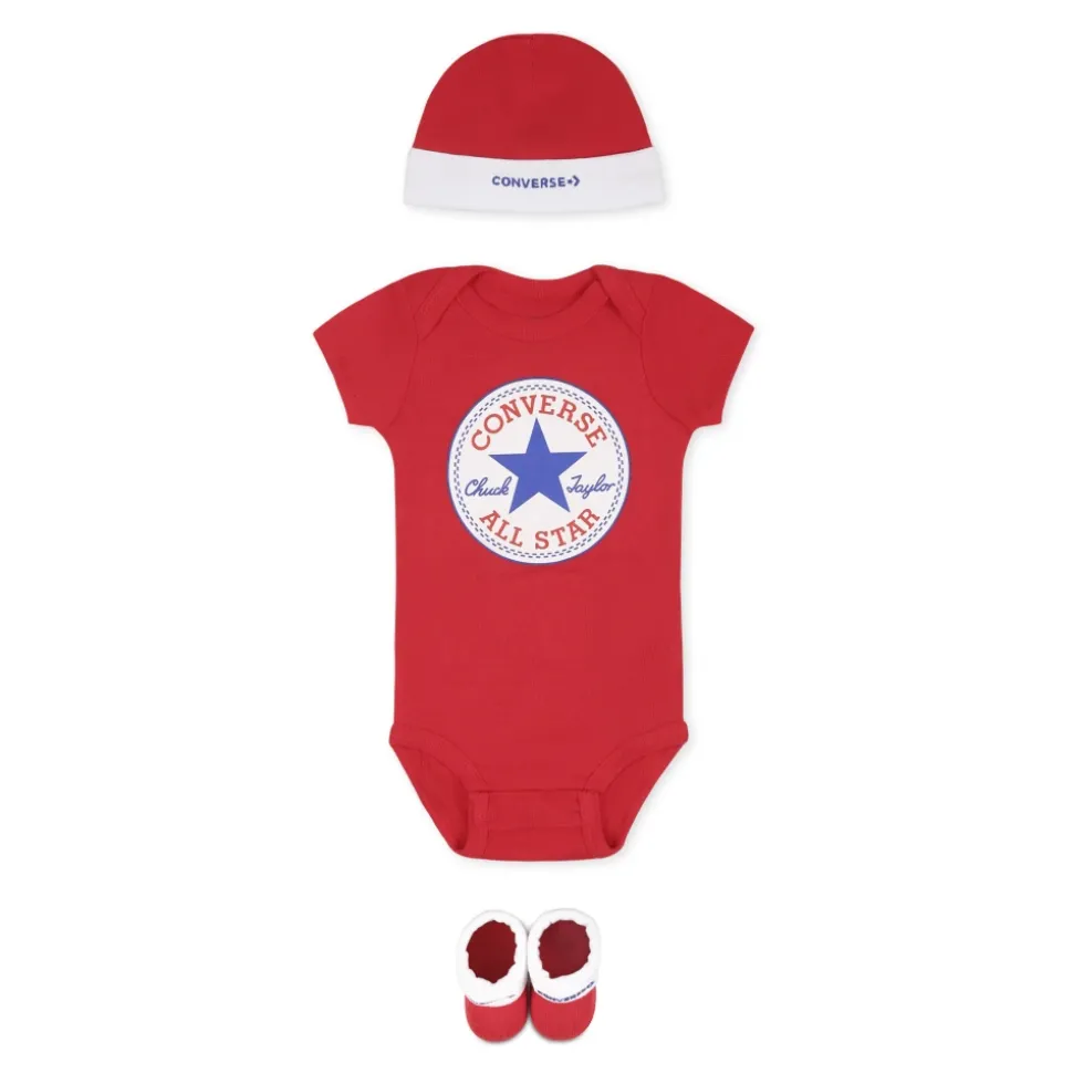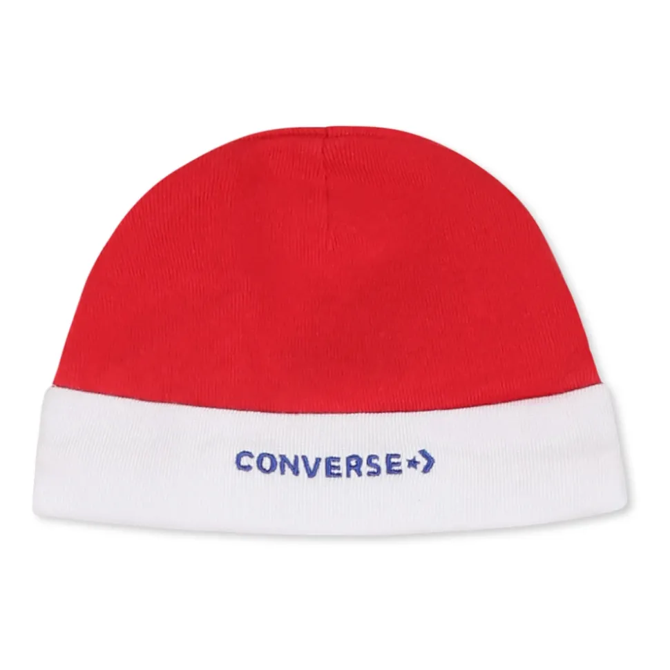 Kleed je kleintje in stijl met deze rode katoenen blend set van Converse. De set bestaat uit een korte mouwen body met een geribbelde ronde hals en drukknopen, een muts en slofjes, allemaal versierd met het iconische Converse-logo. Gemaakt van 60% katoen en 40% polyester, is deze set zowel comfortabel als stijlvol. Machinewasbaar op 30°C.