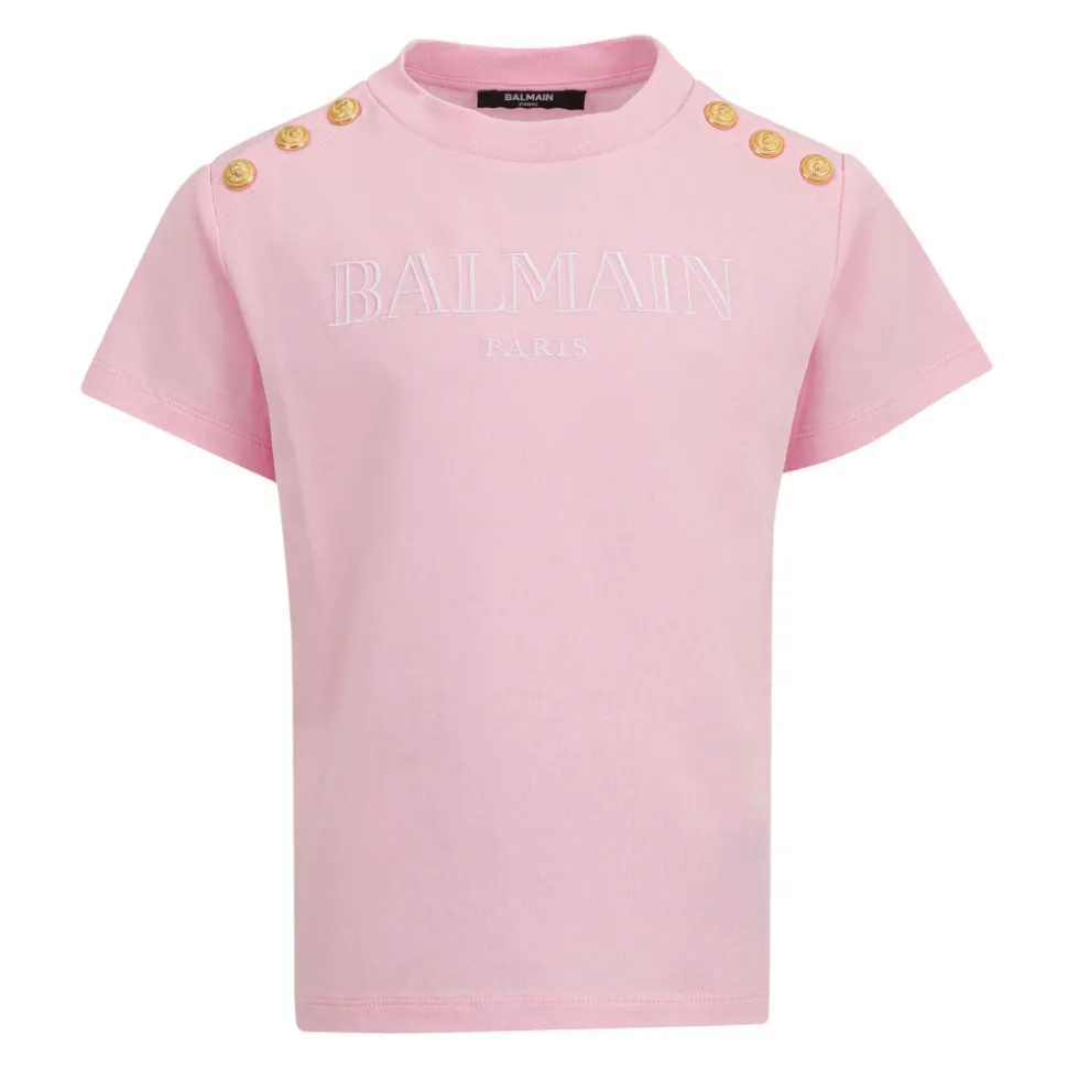 Upgrade de garderobe van je kleine meid met deze Balmain roze T-shirt. Met een ronde hals, korte mouwen en goudkleurige knopen op de schouders, is dit shirt versierd met witte ‘BALMAIN PARIS’ borduursel op de voorkant. Gemaakt in Portugal van 100% katoen, biedt het een reguliere pasvorm voor de hele dag comfort.
