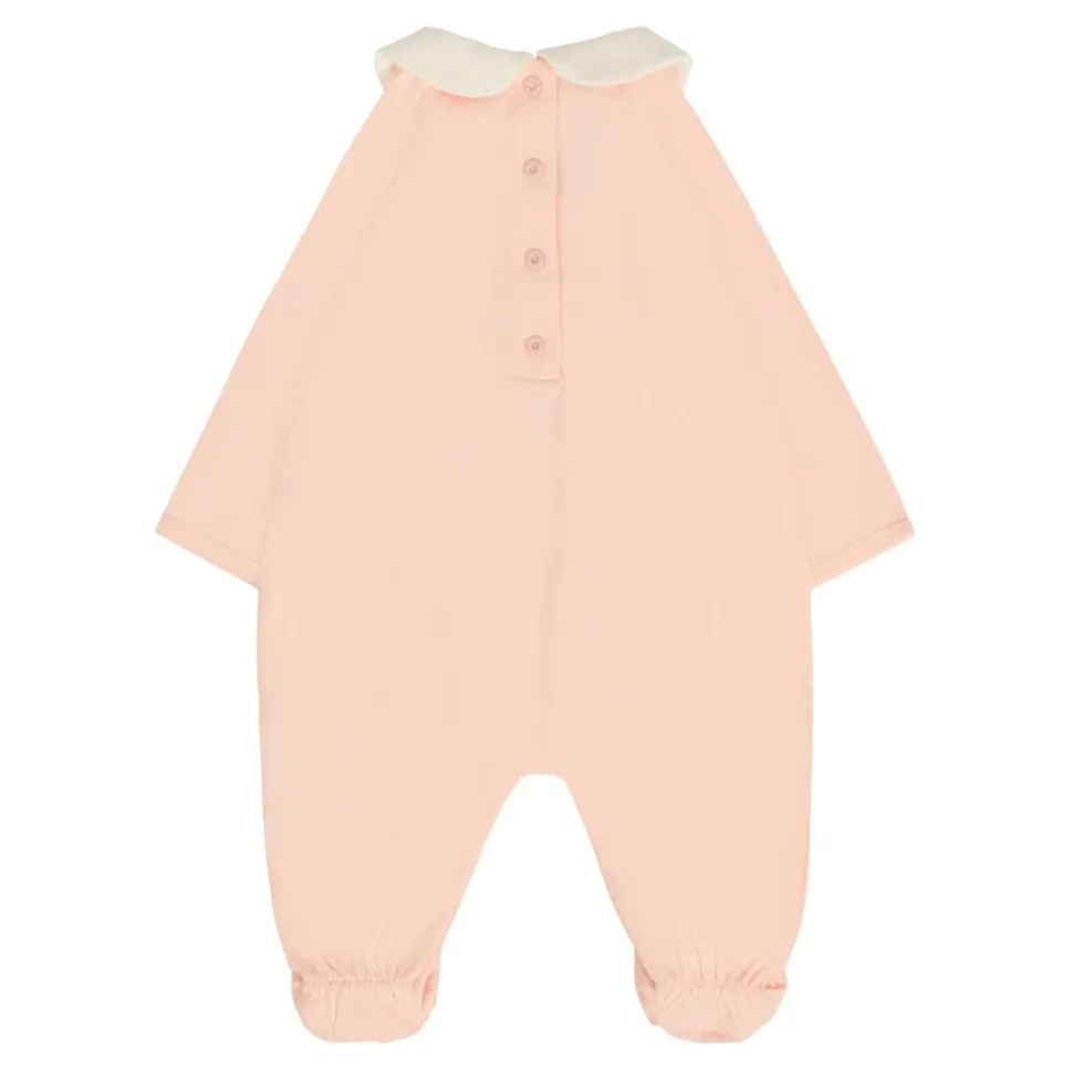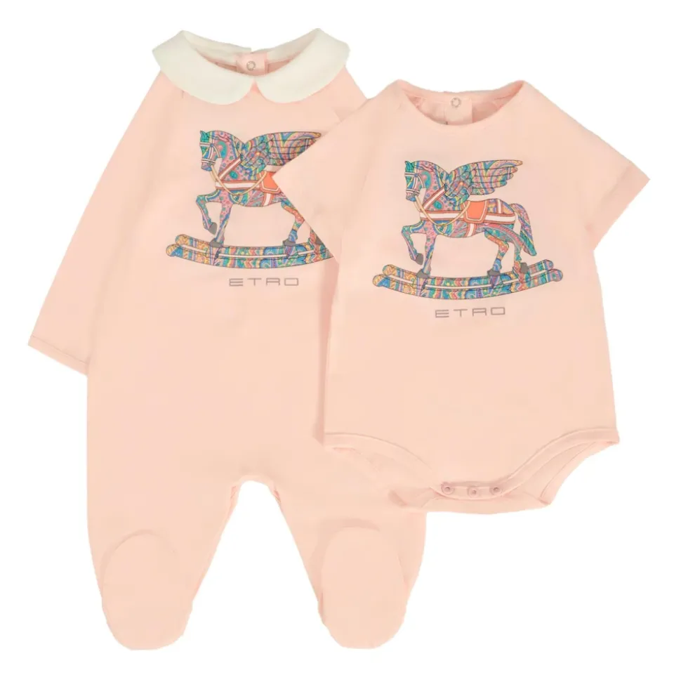 Etro Pink Cotton Babygrow Set voor baby’s, bestaande uit een babygrow met lange mouwen met witte peter pan-kraag en drukknoopsluiting, en een bodysuit met korte mouwen met ronde hals en drukknoopsluiting. Versierd met Pegasus, paisley-print en logo-details op de voorkant. Gemaakt van 100% katoen. Machinewas op 30°C.