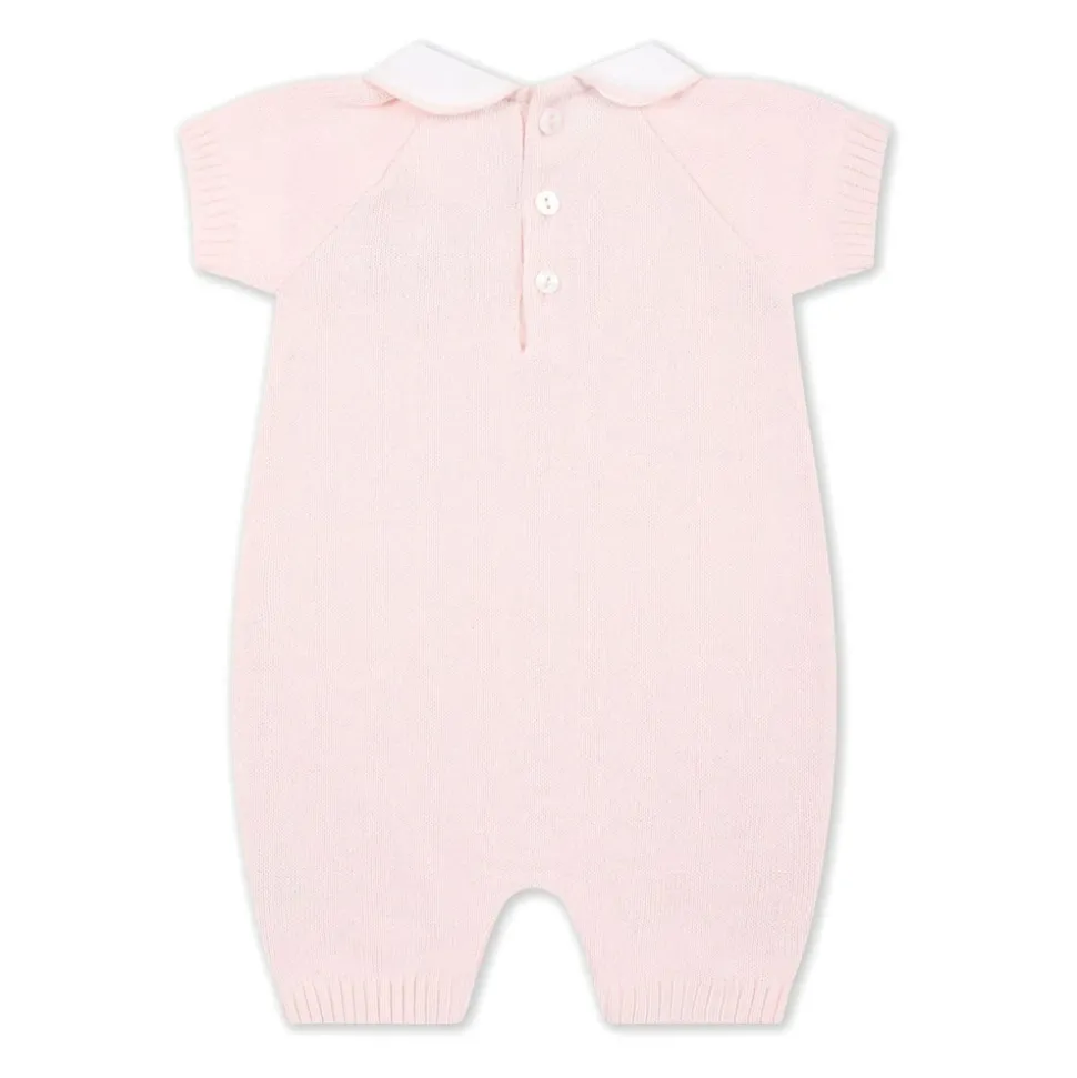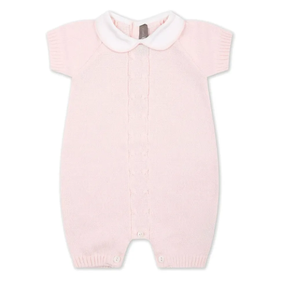 Kleed je kleintje in stijl met deze schattige Little Bear lichtroze katoenen romper. Gemaakt van fijn gebreid katoen met een kabelbreisel, voorzien van een charmante Peter Pan-kraag, korte mouwen, achterknoopsluiting en geribbelde afwerking voor een schattige en comfortabele uitstraling.