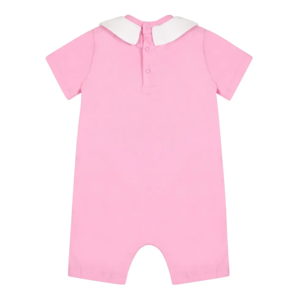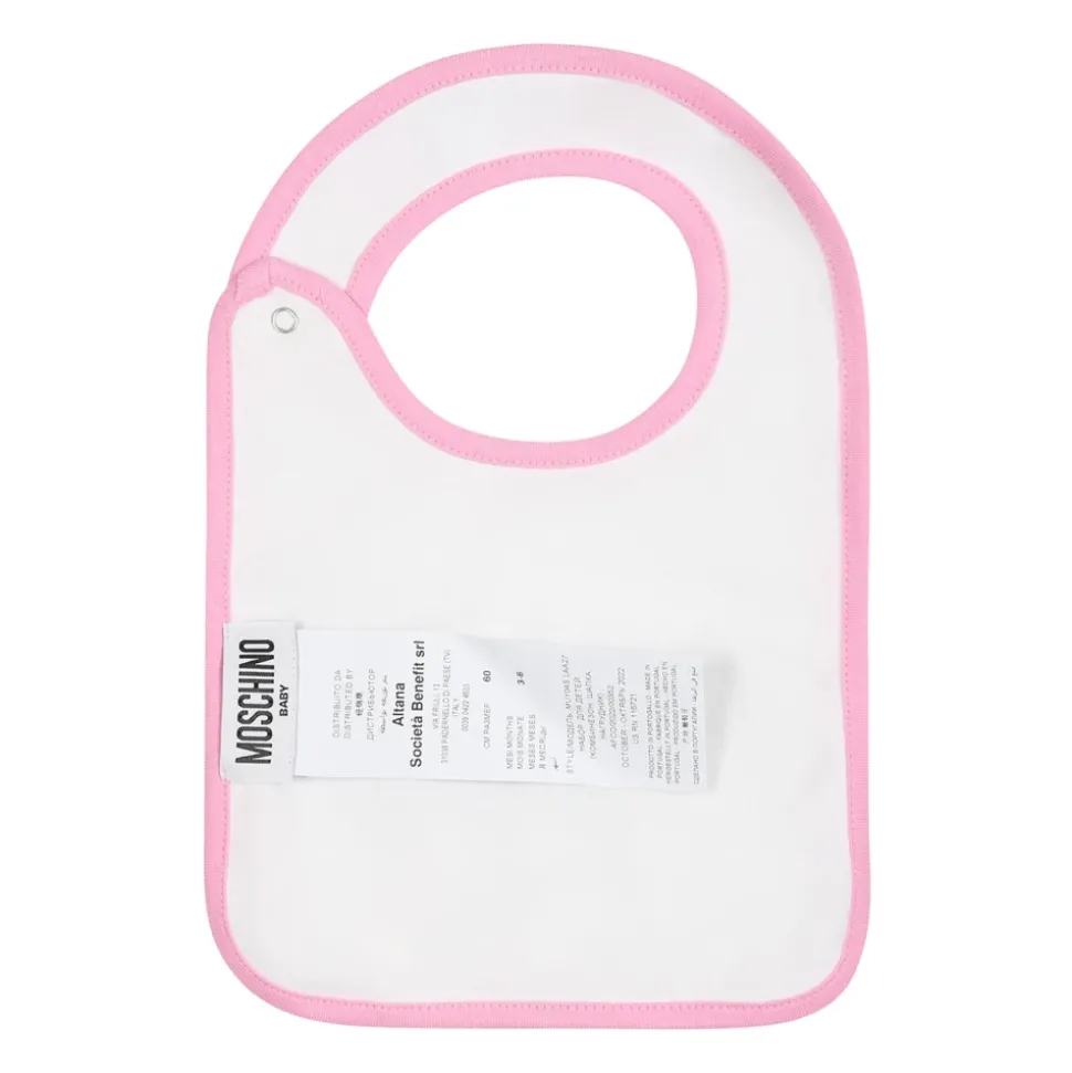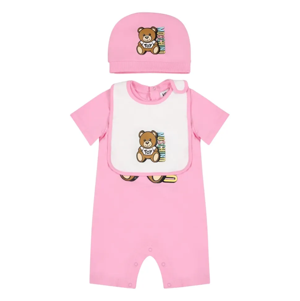 Kleed je kleintje in stijl met deze schattige Moschino roze set. Gemaakt van 100% katoen, deze set bevat een korte mouw romper met een peter pan kraag en drukknoopsluiting, een wit slabbetje met automatische knopen, en een schattige muts. Elk stuk is versierd met een Teddybeer en een multicolor logo. Machinewasbaar op 30°C.