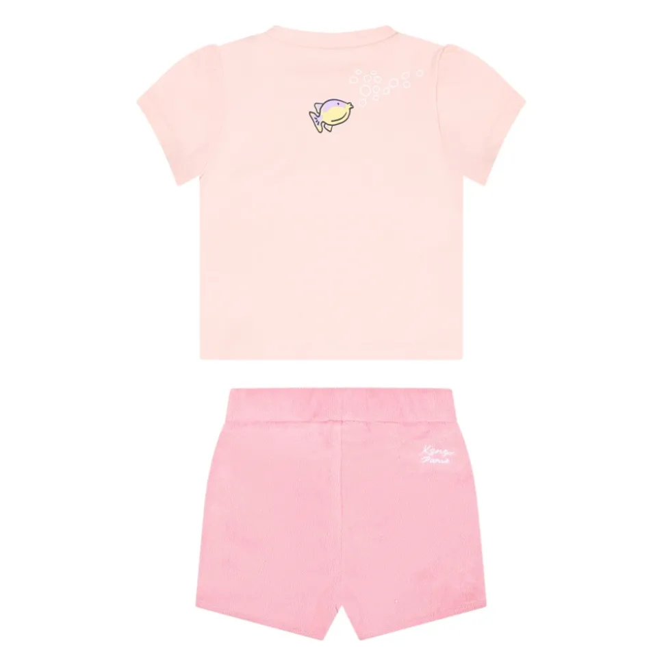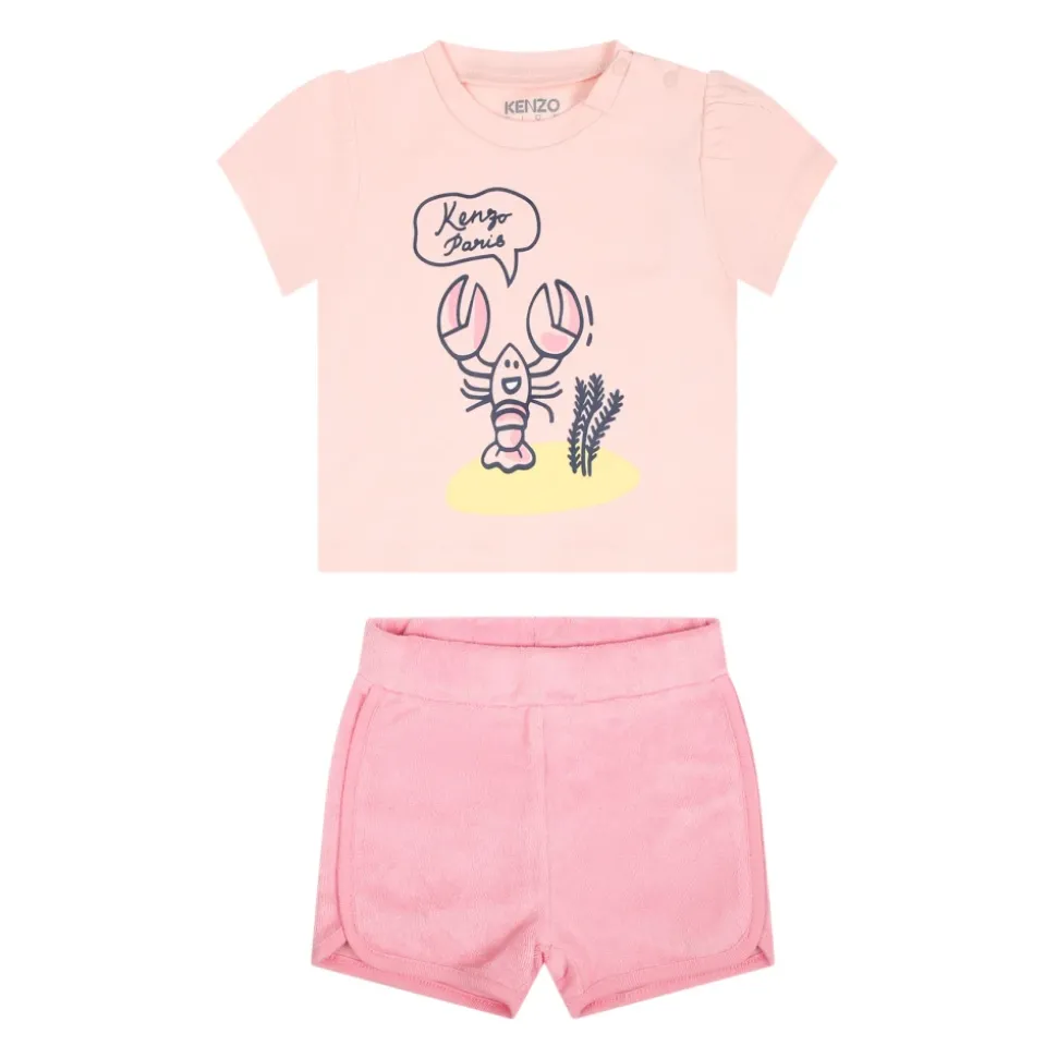 Kleed je kleintje in stijl met dit 100% katoenen roze pak van Kenzo. De set bevat een korte mouwen t-shirt met een geribbelde ronde hals en marineprint, evenals shorts met een elastische tailleband en logoborduursel. Perfect voor speeltijd of uitstapjes!