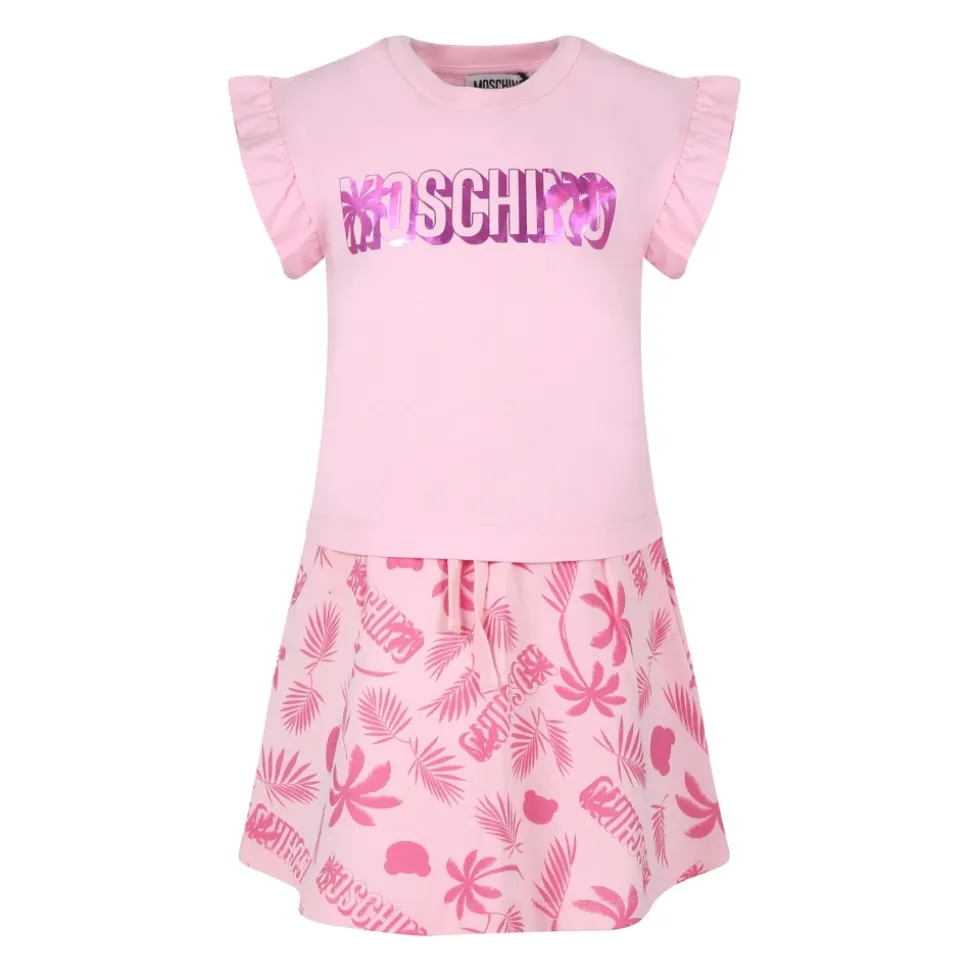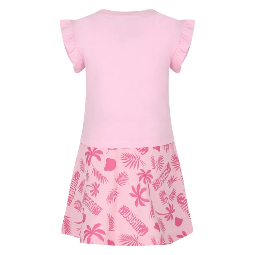 Kleed je kleine meisje in stijl met dit roze katoenen pak van Moschino. De set bestaat uit een T-shirt met korte mouwen, ruches en een geribbelde ronde hals, met een metallic fuchsia logo en palmbomenprint. De rok heeft een elastische taille, trekkoord en zijzakken, versierd met een Teddy Bear-print, logo en allover palmbomenontwerp. Gemaakt van 100% katoen. Handwas aanbevolen.