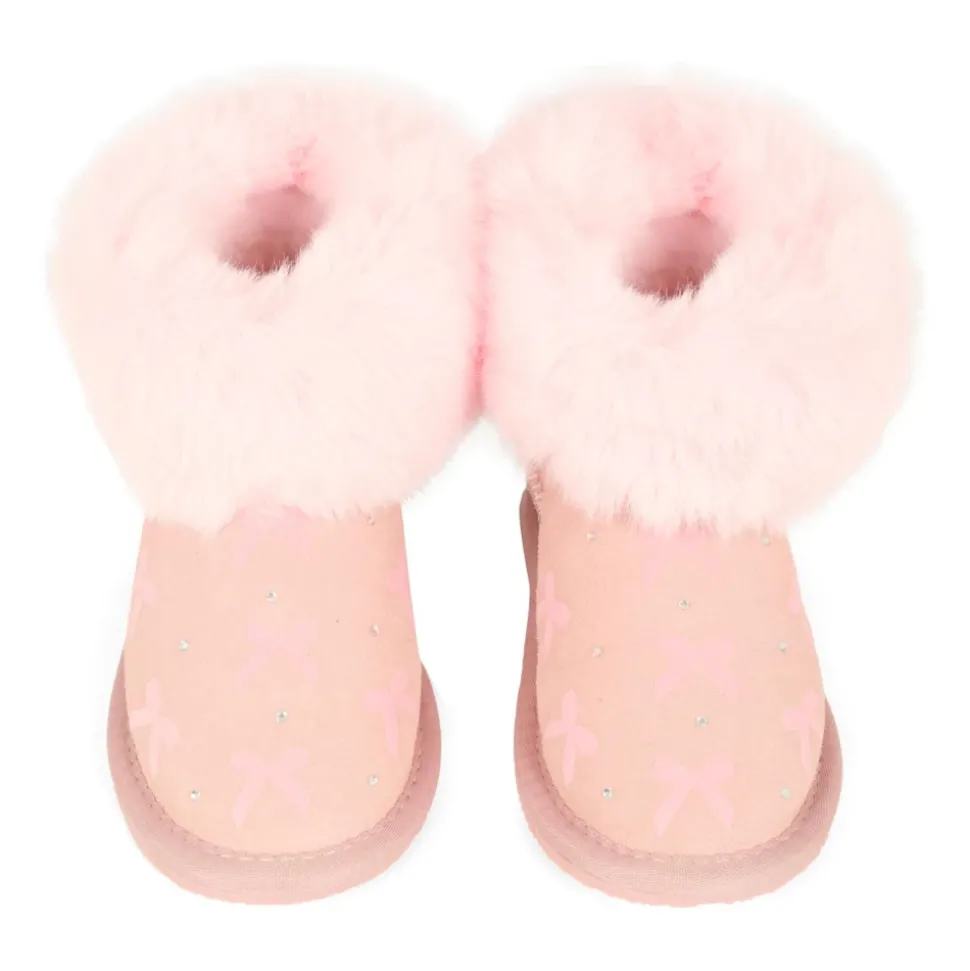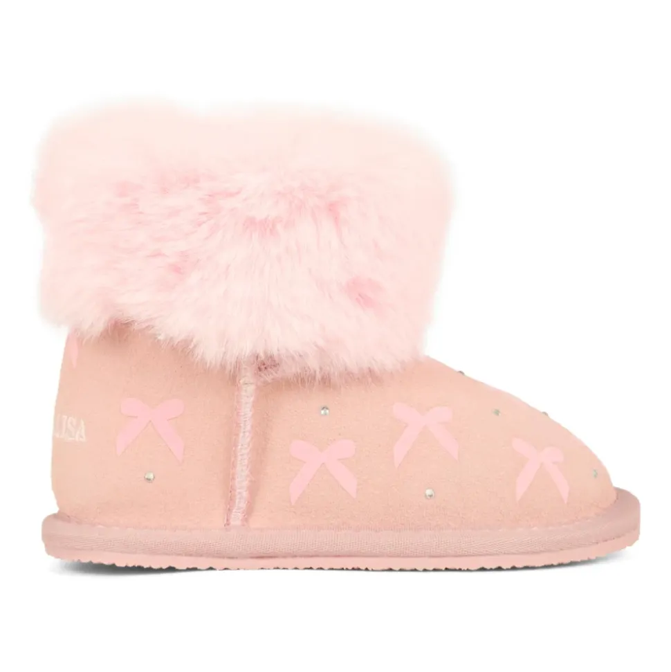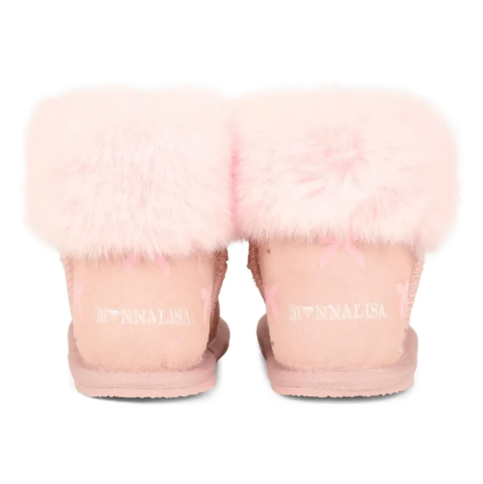Upgrade de stijl van je kleintje met deze roze suède enkellaarsjes van Monnalisa. Voorzien van rubberen zolen, faux fur voering, faux fur detail, strassteentjes, strik en geborduurd logo op de achterkant. Gemaakt van 100% leer.