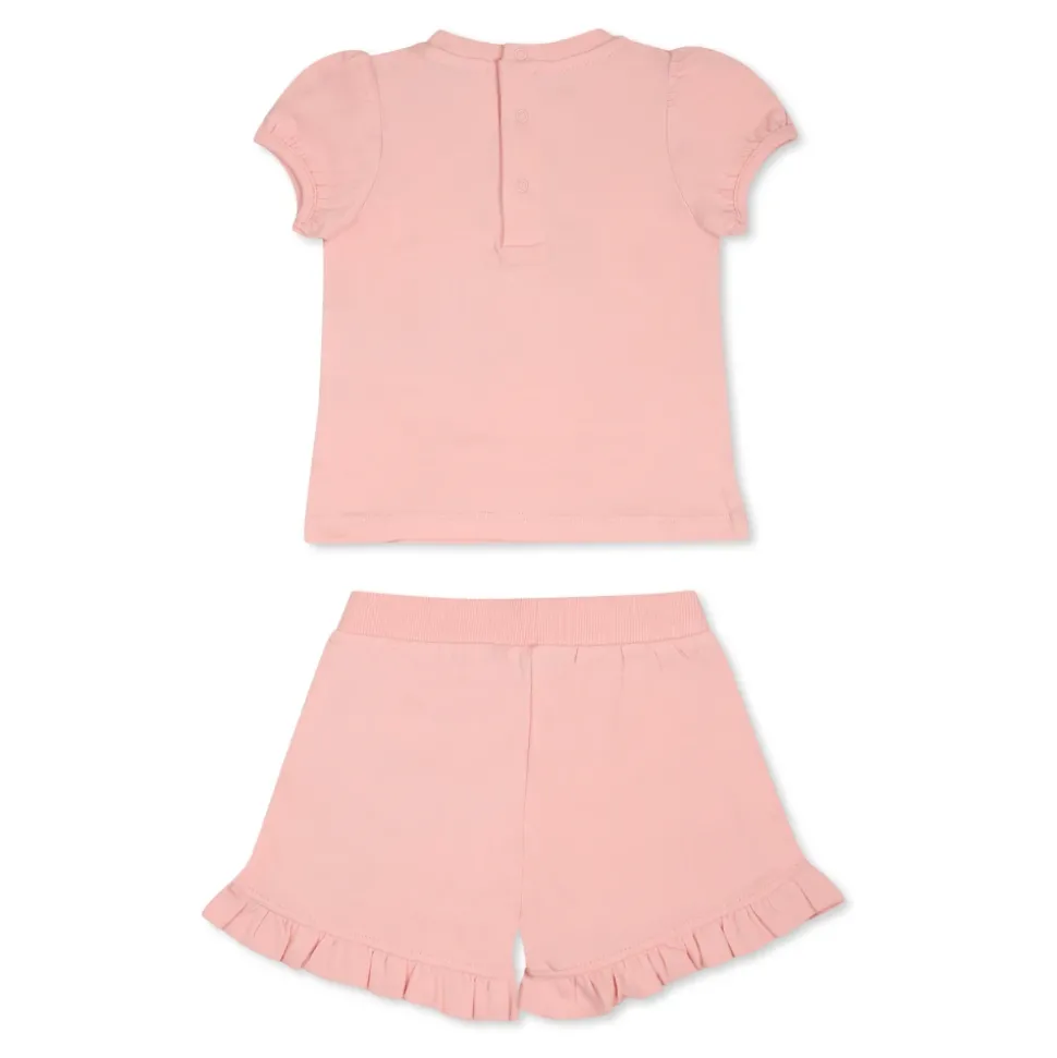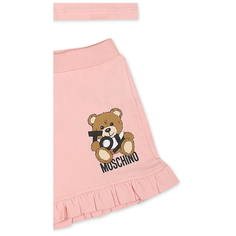 Kleed je kleintje in stijl met dit roze pak van het merk Moschino Kids. Gemaakt van een comfortabele katoenmix, bestaande uit een T-shirt met korte mouwen en pofhals, geribbelde ronde hals en drukknoopsluiting op de achterkant; shorts met elastische taille en gerimpelde zoom. Versierd met Teddy Bear, Toy writing en logo-details op de voorkant. Samenstelling: 95% katoen, 5% elastaan. Machinewas op 30°C.