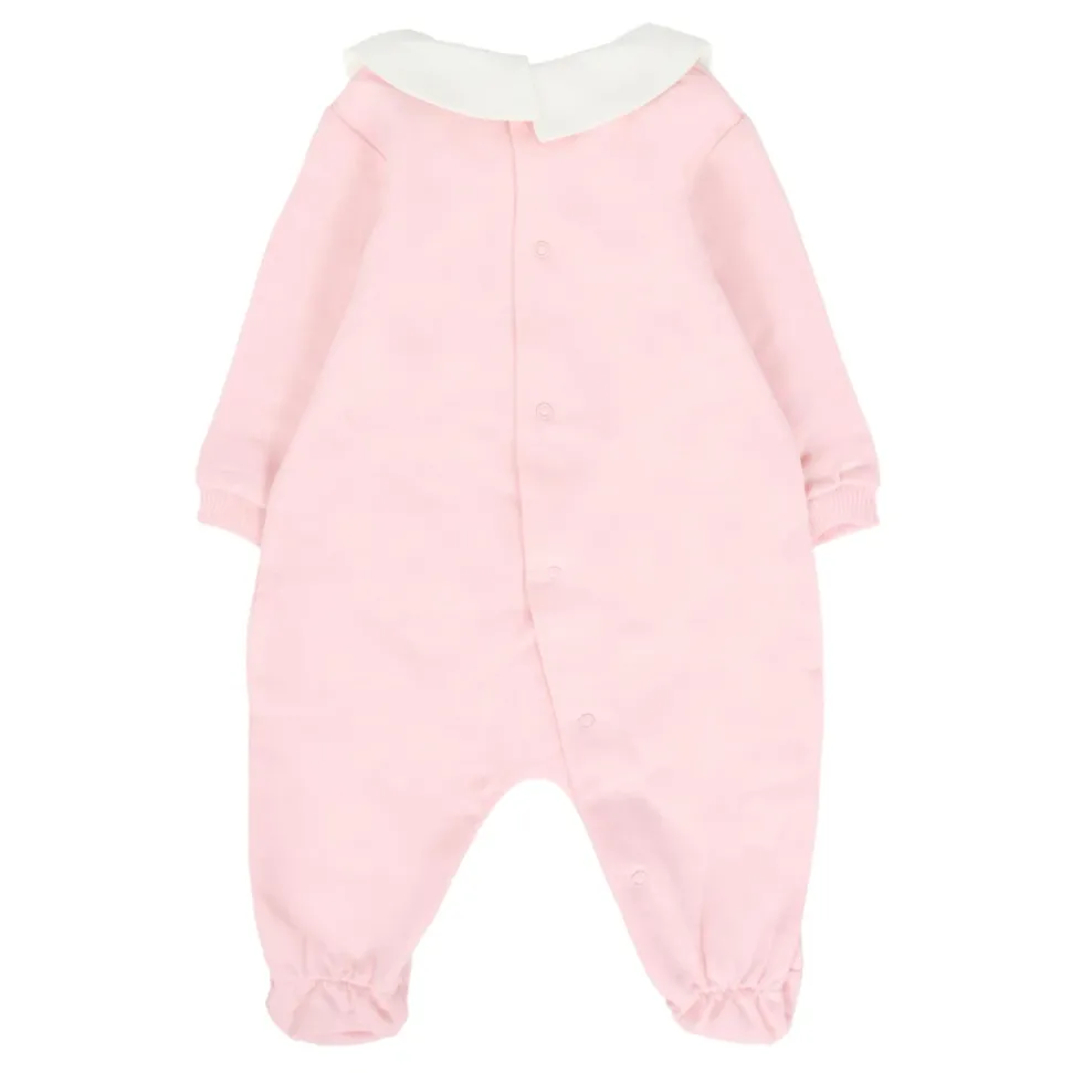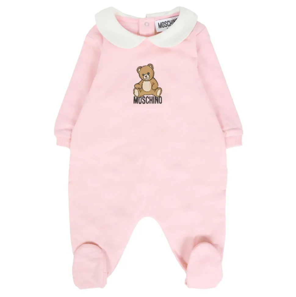 Kleed je kleintje in stijl met deze roze babygrow van Moschino Kids. Gemaakt van fleece katoen, met lange mouwen, een witte Peter Pan kraag, drukknopen op de achterkant, voetjes en geribbelde manchetten. Versierd met een schattige Teddy Beer print en logo op de voorkant. Gemaakt van 100% katoen. Machinewas op 30°C.