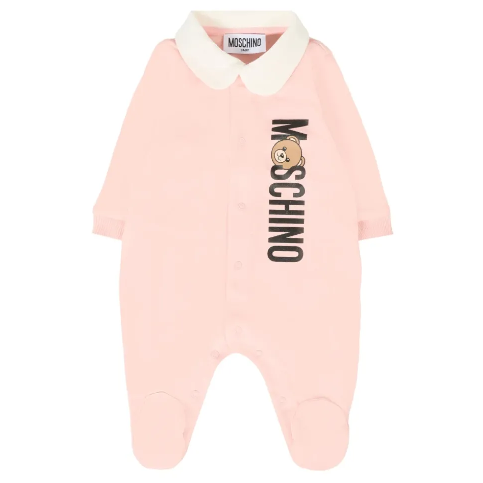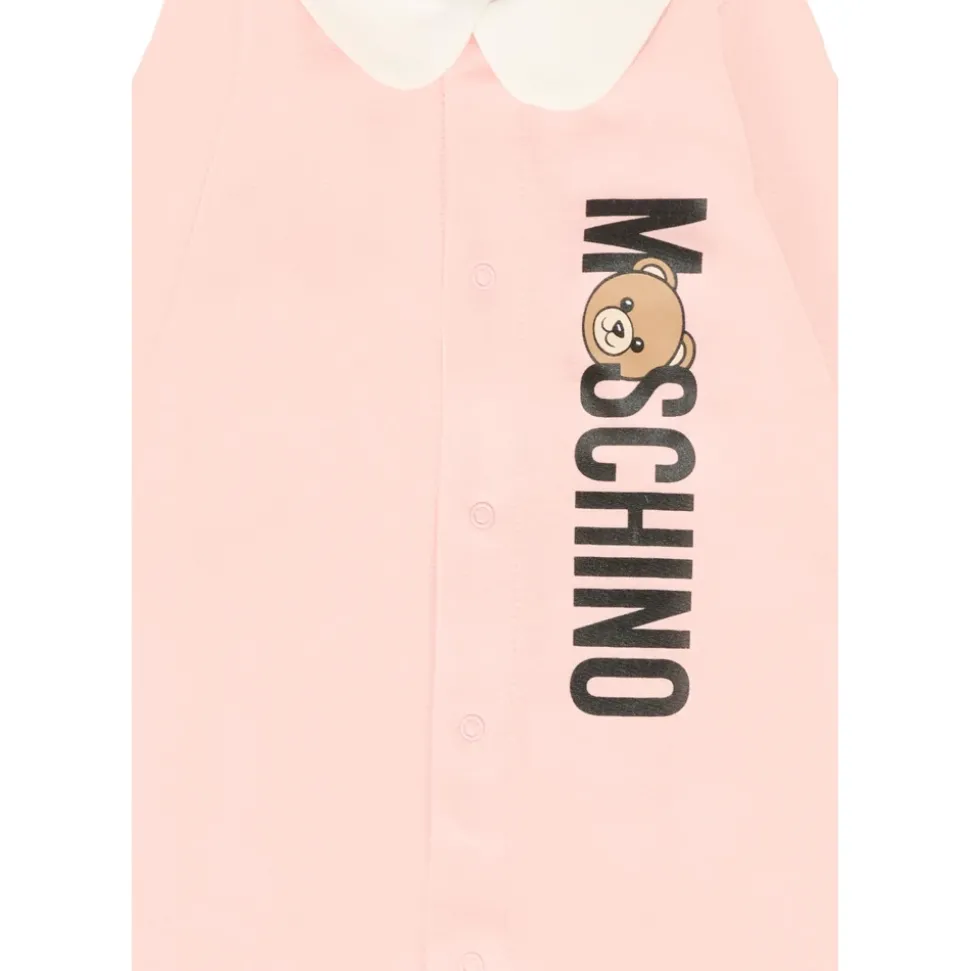 Kleed je kleintje in stijl met deze roze babygrow van Moschino Kids, gemaakt van fleece katoen. Het heeft lange mouwen, een witte Peter Pan-kraag, drukknoopsluitingen aan de voorkant en tussen de benen, en geribbelde voeten en manchetten. Versierd met een schattige Teddy Bear-print en logo aan de voorkant. Gemaakt van 100% katoen. Machinewas op 30°C.