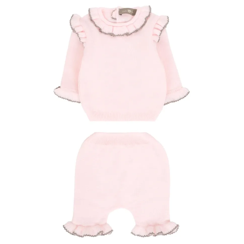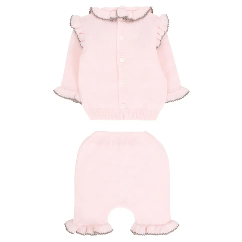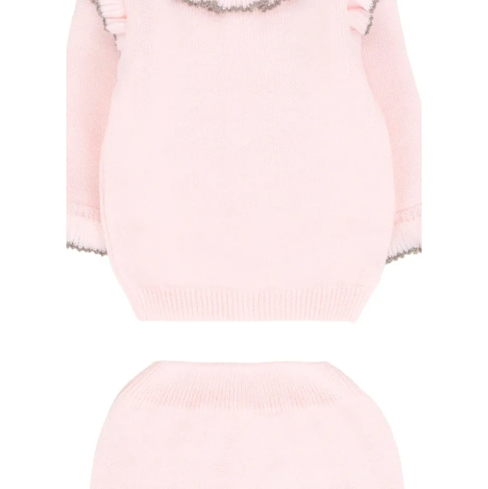 Kleed je kleintje in stijl met deze schattige roze set van zuivere wol van Little Bear. Gemaakt in Italië, deze set bestaat uit een trui met lange mouwen met een gerimpelde kraag en knoopsluiting, versierd met ruches en taupe biezen. De broek heeft een elastische geribbelde tailleband en bijpassende ruches onderaan. Gemaakt van 100% zuivere wol, is deze set zowel gezellig als chique. Wasinstructies: Wassen op 30°C.