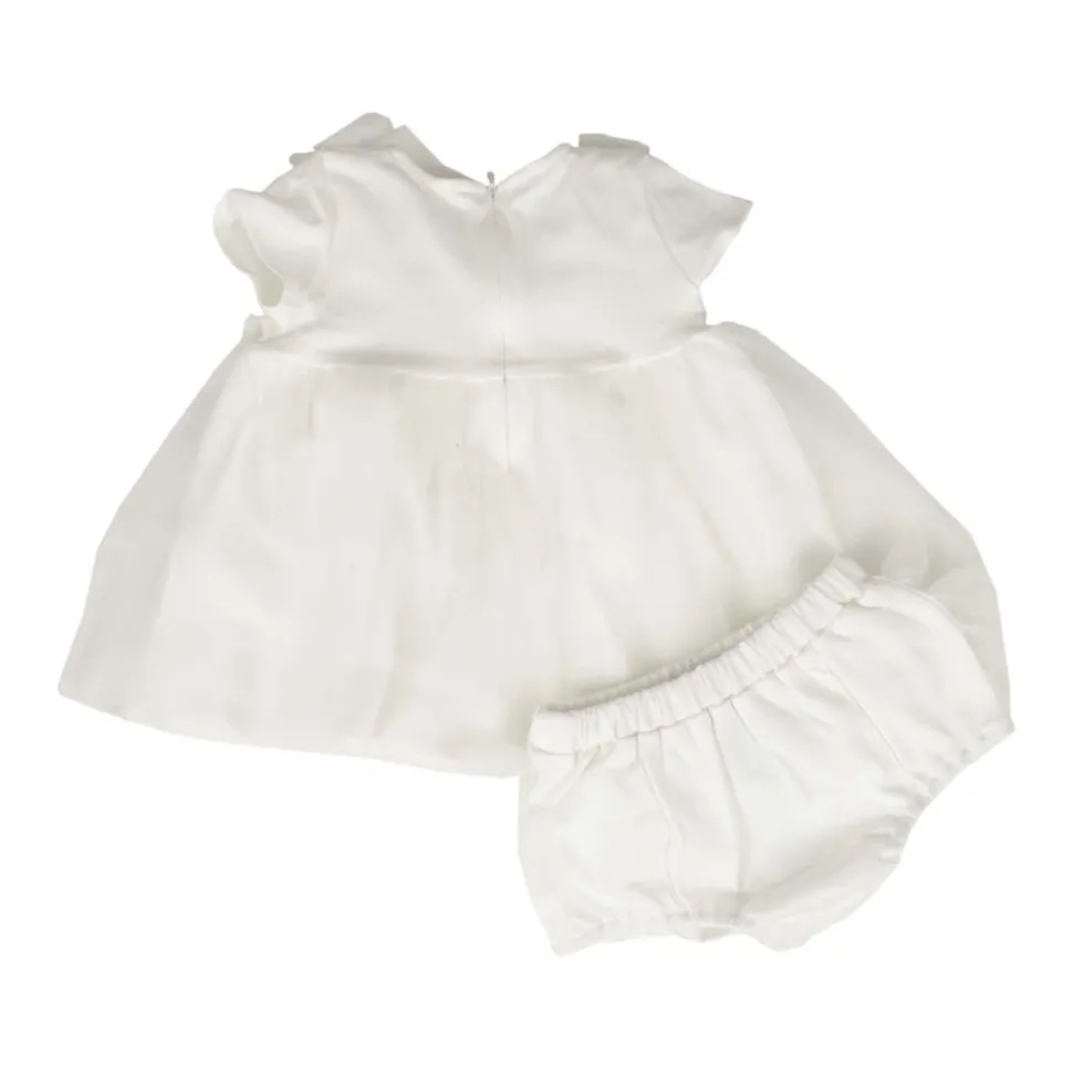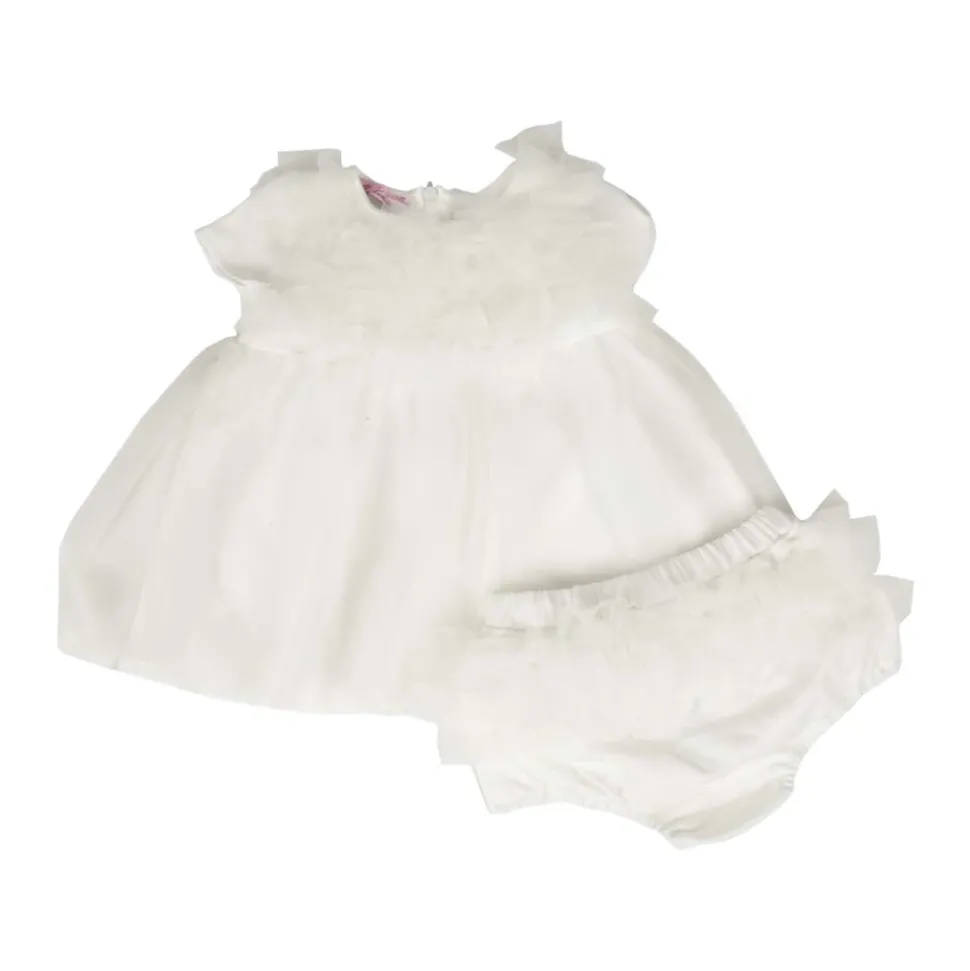 Kleed je kleine meisje in stijl met deze witte babyjurk van Miss Blumarine. Met halve mouwen, een ronde halslijn, een laag tule op de rok, tule rozenapplicaties en bijpassende broekjes. Gemaakt van 100% polyester.