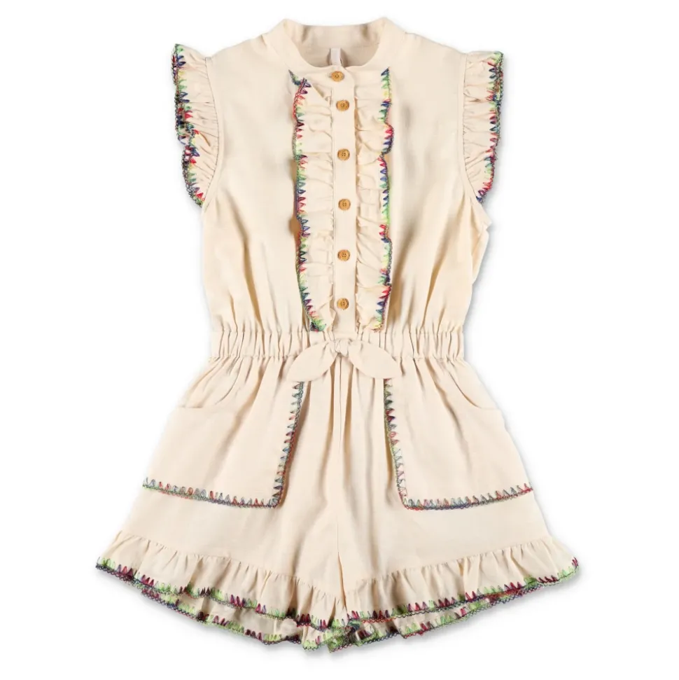 Kleed je kleine meisje in stijl en comfort met deze ivoren Lucky frill playsuit van Zimmermann. Deze katoenen playsuit heeft gerimpelde mouwen, een elastische taille met een vaste strik, voorzakken en een charmante ronde hals met knopen aan de voorkant. Perfect voor speelse dagen uit, biedt deze playsuit een schattige en praktische look voor je kleintje.