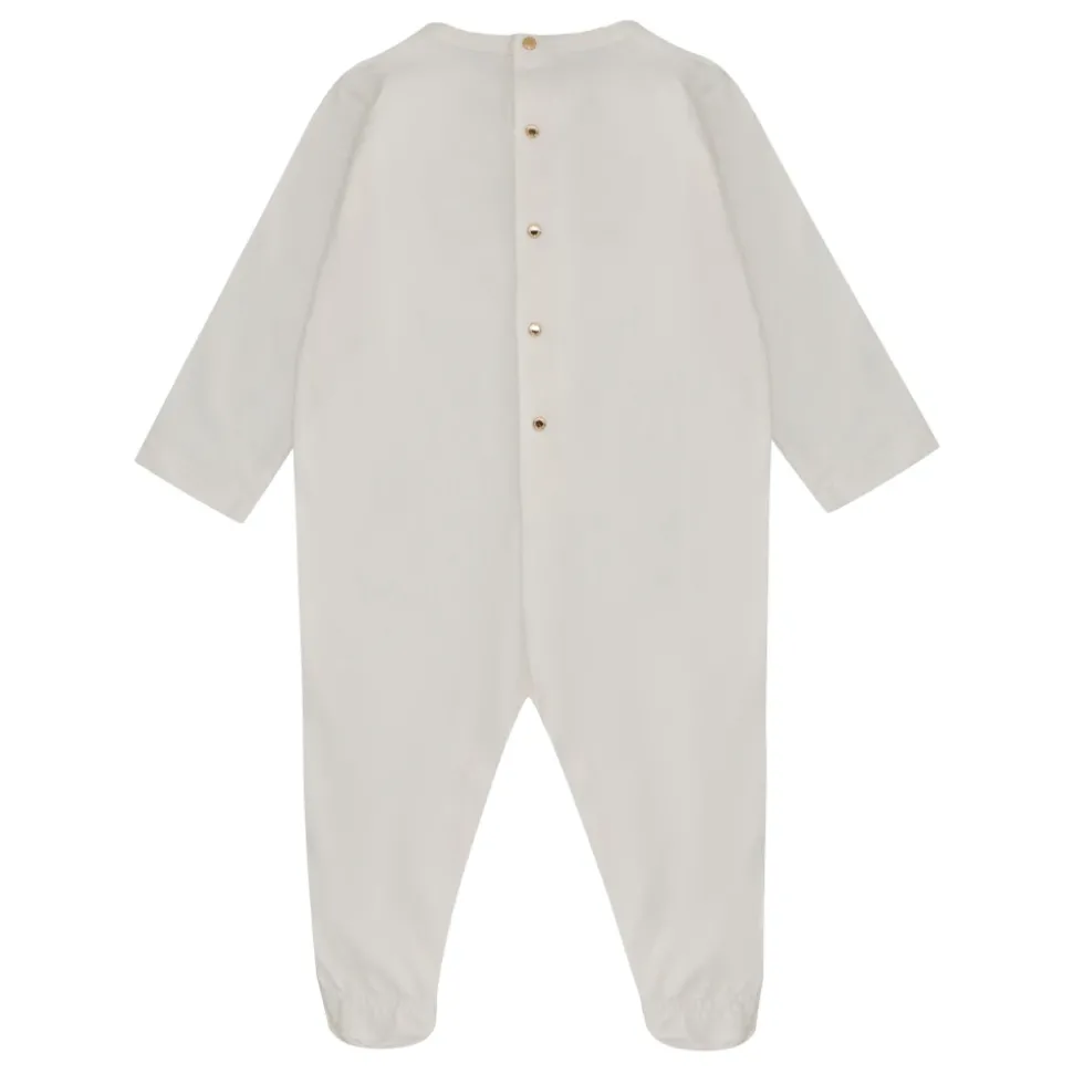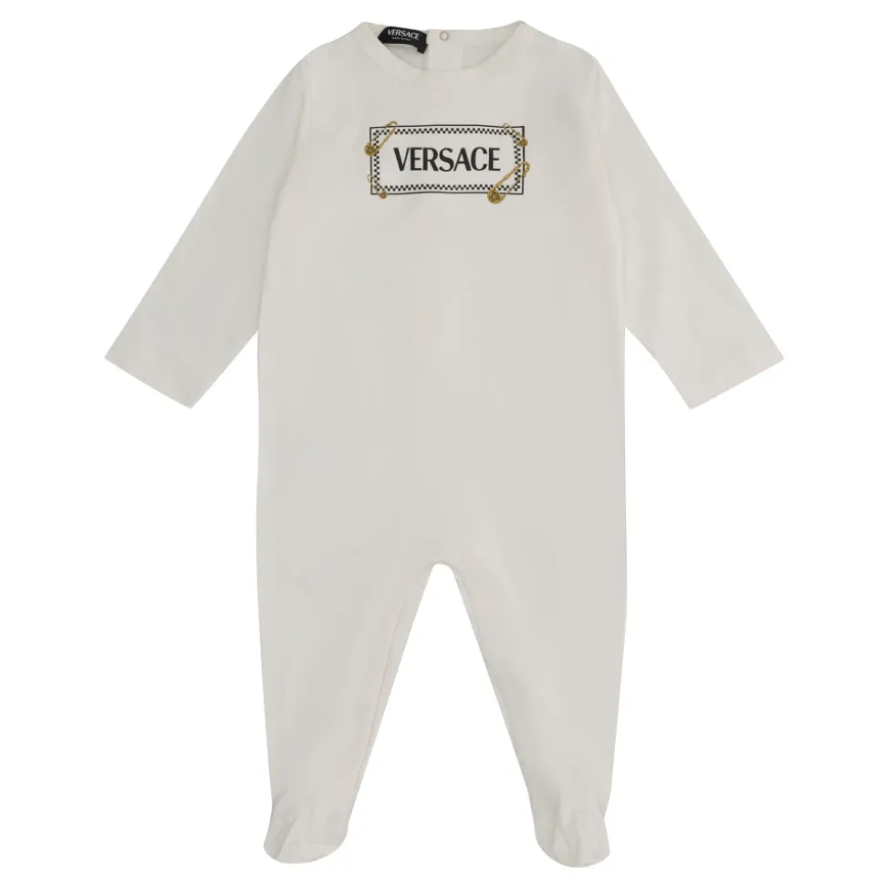 Versace Safety Pin Logo Sleepsuit is een zachte katoenen jersey onesie, ontworpen voor gemakkelijk aankleden en dagelijks comfort. Het heeft een kenmerkende Safety Pin Logo print en drukknoopsluitingen voor snelle verschoningen. Belangrijkste kenmerken: Wit | Katoen | Stretch jersey | Zacht gevoel | Drukknoopsluiting aan de achterkant | Geïntegreerde voetjes | Ronde hals | Geribbelde kraag | Lange mouwen | Safety Pin Logo print | Samenstelling & verzorging: 91% katoen | 9% elastaan | Volg de instructies op het waslabel.