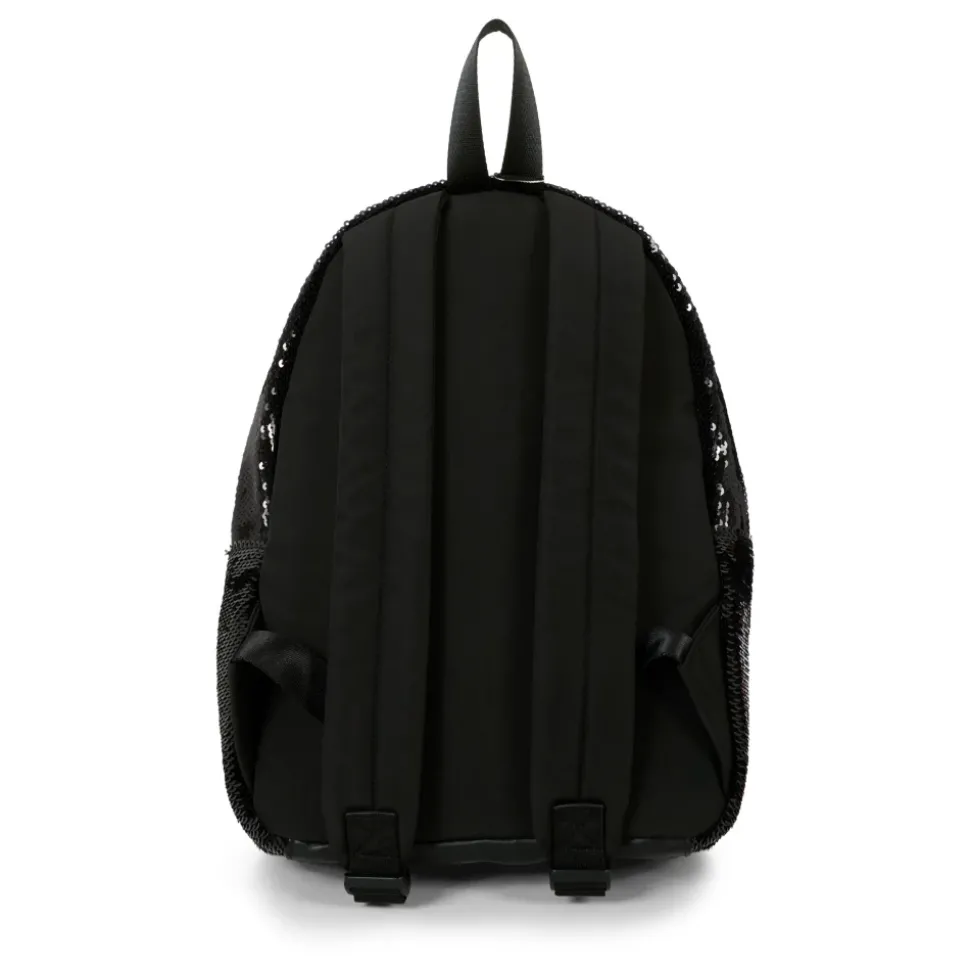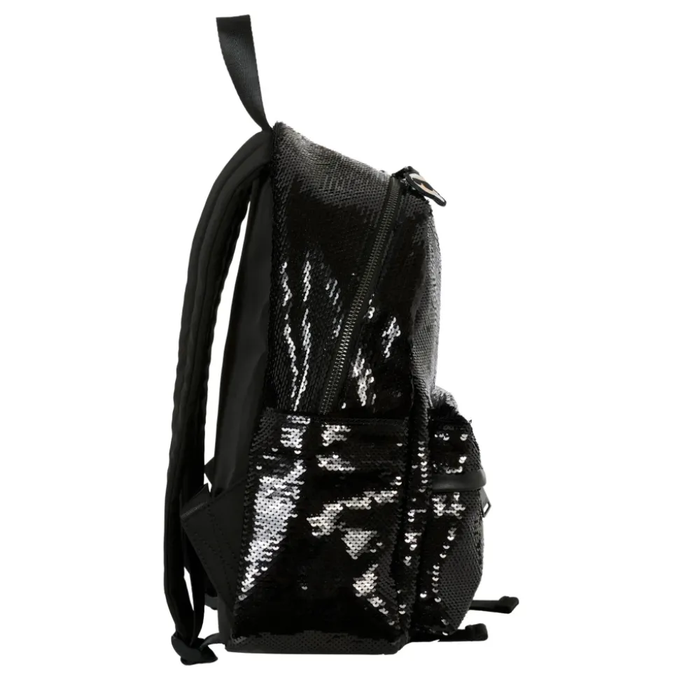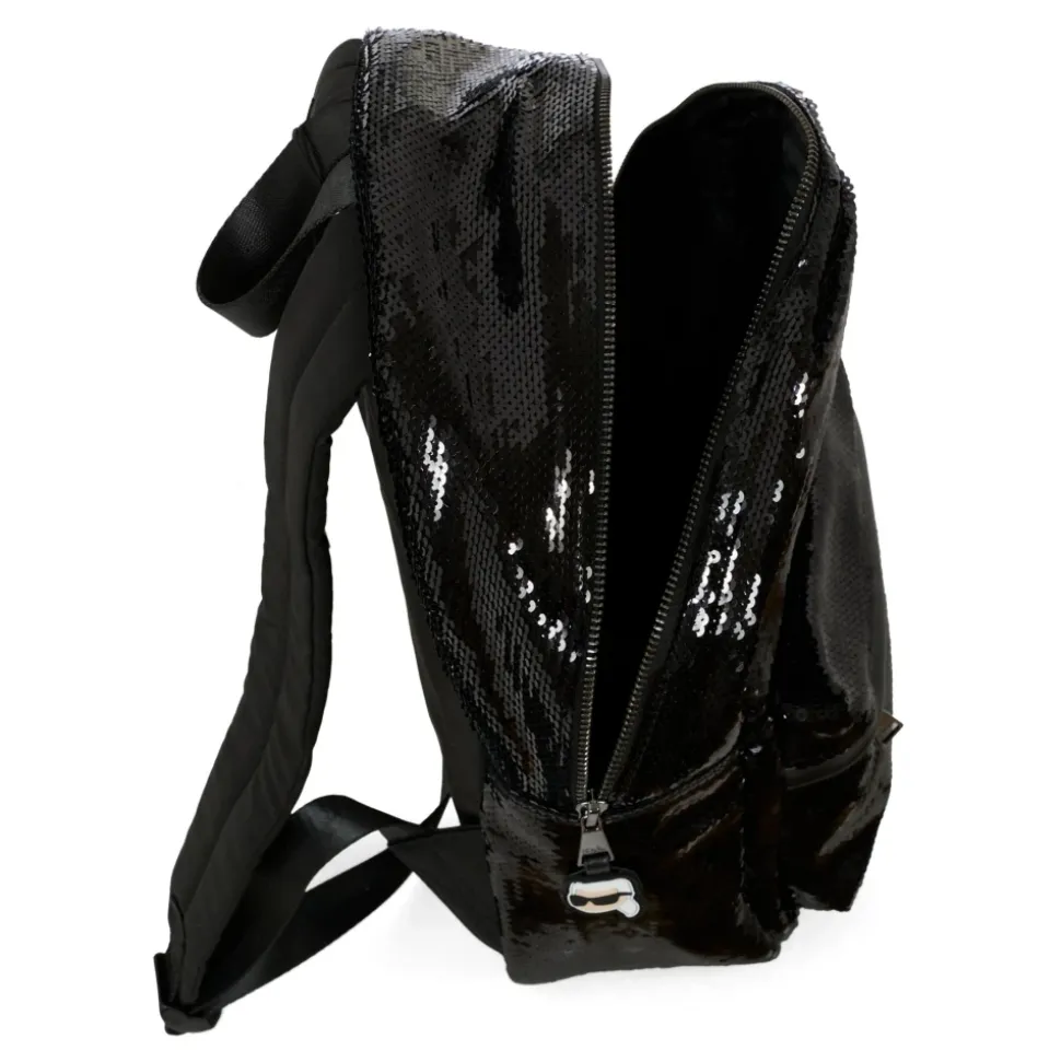 Kleur: ZwartBeschrijving: Zwarte rugzak met allover pailletten, ritssluiting aan de bovenkant, verstelbare schouderbanden en ritszak aan de voorkant. Het is versierd met Karl Lagerfeld en Choupette op de rits.Details: 100% polyester.