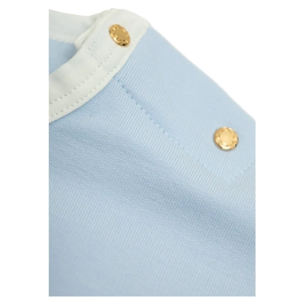 De Versace Kids Set: Top en Shorts combineert klassieke stijl met modern design, met elegante details zoals gouden knopen en een uniek Medusa-patroon. Belangrijkste kenmerken: Lichtblauw | Blauw | Katoen | Elastaan | Elastische tailleband | Korte mouwen met contrasterende kleur | Gouden knopen op de schouder | Medusa-patroon op de top | “Versace” op de achterkant van de shorts | Afmetingen en pasvorm: Comfortabele pasvorm | Samenstelling en onderhoud: Katoen | Elastaan | Machinewas koud, droogtrommel laag