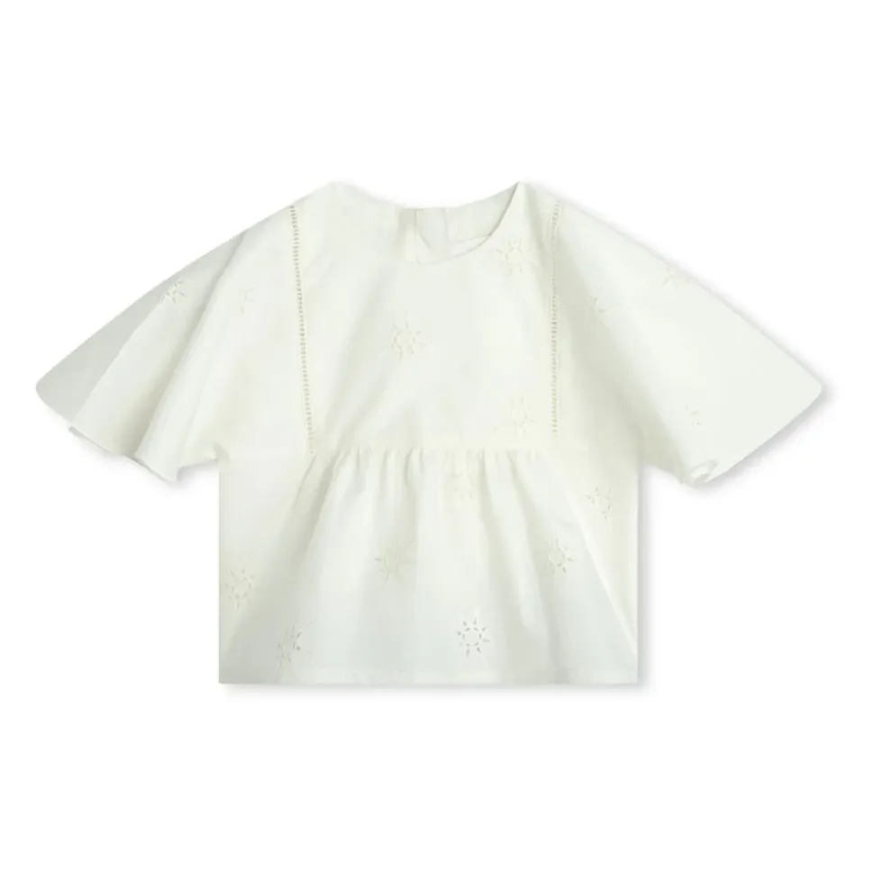 De Shirt met Sterrenborduursel van Chloé is een charmante toevoeging aan elke garderobe, met delicate sterrenborduursels op een helderwitte katoenen achtergrond. Ideaal voor casual uitstapjes, deze blouse combineert elegantie met comfort. Belangrijkste kenmerken: Wit | Katoen | Ronde hals | Ritssluiting aan de achterkant | Korte mouwen | Rechte zoom | Sterrenborduursel | Samenstelling en onderhoud: 100% Katoen | Machinewas koud, droogtrommel laag.